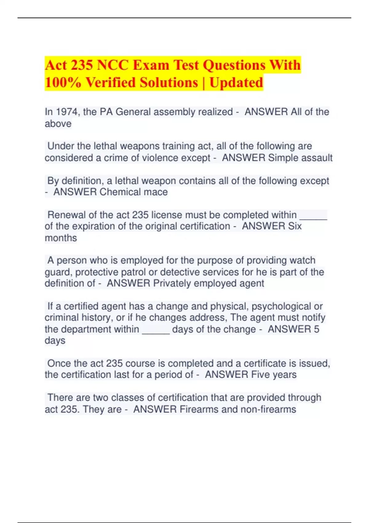 Act 235 NCCAct 235 NCC Exam Test Questions With 100% Verified Solutions | Updated In 1974, the PA General assembly realized - ANSWER All of the above Under the lethal weapons training act, all of the following are considered a crime of violence except - ANSWER Simple assault By definition, a lethal weapon contains all of the following except - ANSWER Chemical mace Renewal of the act 235 license must be completed within _____ of the expiration of the original certification - ANSWER Six months A person who is employed for the purpose of providing watch guard, protective patrol or detective services for he is part of the definition of - ANSWER Privately employed agent If a certified agent has a change and physical, psychological or criminal history, or if he changes address, The agent must notify the department within _____ days of the change - ANSWER 5 days Once the act 235 course is completed and a certificate is issued, the certification last for a period of - ANSWER Five years There are two classes of certification that are provided through act 235. They are - ANSWER Firearms and non-firearms Under the private detective act of 1953, a private detective business consist of - ANSWER All of the above Which of the following is a true statement - ANSWER Use of force is justifiable when the actor believes that such force is immediately necessary for the purpose of protecting himself against the use of unlawful force by such other person on the present occasion Which of the following statements is false - ANSWER No force may be used by private person to prevent or deter a forcible felony Force switch under the circumstance in which it is used, is readily capable of causing death or serious bodily injury is the definition of - ANSWER Deadly force