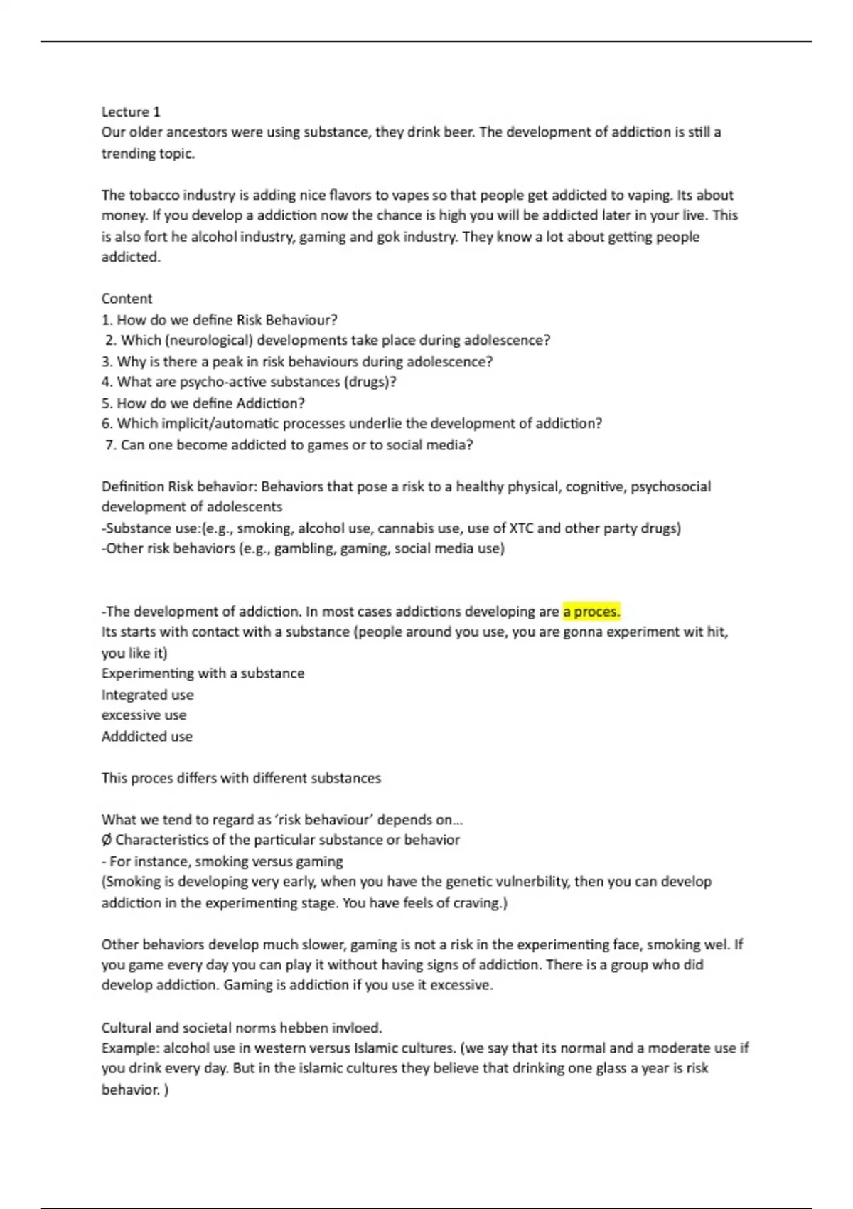 These are my notes from the course risk behavior and addiction in adolescence. This is mainly written in English but sometimes includes Dutch words. The powerpoint has been copied and my own notes are included.