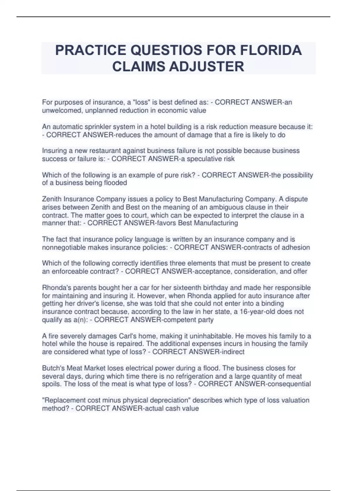 PRACTICE QUESTIOS FOR FLORIDA CLAIMS ADJUSTER For purposes of insurance, a "loss" is best defined as: - CORRECT ANSWER-an unwelcomed, unplanned reduction in economic value An automatic sprinkler system in a hotel building is a risk reduction measure because it: - CORRECT ANSWER-reduces the amount of damage that a fire is likely to do Insuring a new restaurant against business failure is not possible because business success or failure is: - CORRECT ANSWER-a speculative risk Which of the following is an example of pure risk? - CORRECT ANSWER-the possibility of a business being flooded Zenith Insurance Company issues a policy to Best Manufacturing Company. A dispute arises between Zenith and Best on the meaning of an ambiguous clause in their contract. The matter goes to court, which can be expected to interpret the clause in a manner that: - CORRECT ANSWER-favors Best Manufacturing The fact that insurance policy language is written by an insurance company and is nonnegotiable makes insurance policies: - CORRECT ANSWER-contracts of adhesion Which of the following correctly identifies three elements that must be present to create an enforceable contract? - CORRECT ANSWER-acceptance, consideration, and offer Rhonda's parents bought her a car for her sixteenth birthday and made her responsible for maintaining and insuring it. However, when Rhonda applied for auto insurance after getting her driver's license, she was told that she could not enter into a binding insurance contract because, according to the law in her state, a 16-year-old does not qualify as a(n): - CORRECT ANSWER-competent party A fire severely damages Carl's home, making it uninhabitable. He moves his family to a hotel while the house is repaired. The additional expenses incurs in housing the family are considered what type of loss? - CORRECT ANSWER-indirect Butch's Meat Market loses electrical power during a flood. The business closes for several days, during which time there is no refrigeration and a large quantity of meat spoils. The loss of the meat is what type of loss? - CORRECT ANSWER-consequential "Replacement cost minus physical depreciation" describes which type of loss valuation method? - CORRECT ANSWER-actual cash value From a property insurance perspective, which of the following is NOT a basic type of construction? - CORRECT ANSWER-steel For an insurer to pay a property insurance claim, when must the policyholder have an insurable interest in the insured property? - CORRECT ANSWER-at the time of the loss Ken's house has an exterior layer of brick that covers wooden walls supported by wooden 2-by-4 studs. What type of construction does Ken's house have? - CORRECT ANSWER-masonry veneer Corinne purchased her home with a 10 percent down payment and a 90 percent mortgage from Sidney Bank. Why does Sidney Bank have an insurable interest in Corinne's house? - CORRECT ANSWER-The bank faces the possibility of a loss if Corinne's house is damaged or destroyed. All of the following are perils EXCEPT: texting while driving theft lightning windstorm - CORRECT ANSWER-texting while driving A dump truck collided with a tall oak tree in Marian's front yard. The tree fell onto her house, breaking a glass picture window and knocking a lamp off the table inside it. Sparks from the lamp started a fire that destroyed half the house. What is the proximate cause of the damage to Marian's house? - CORRECT ANSWER-the collision All of the following causes of loss are commonly listed as excluded perils in open perils property insurance policies, EXCEPT: wear and tear flood war vandalism - CORRECT ANSWER-vandalism While a homeowner is out of town, a group of teenagers break into her house, throw a beer party, and damage the interior without stealing anything. Connie's resulting property insurance claim will be covered if her policy covers what peril(s)? - CORRECT ANSWER-vandalism Laura owns poisonous snakes on her property, which she uses for venom research purposes. One of the snakes escaped and within hours bit a neighbor who sued Laura. Though Laura was not negligent in her ownership of the snakes, the plaintiff easily won the suit based on the doctrine of: - CORRECT ANSWER-strict (absolute) liability Which one of the following incidents is an example of vicarious liability? Rudy is held responsible for an accident caused by his employee. Dominic is held responsible for food poisoning due to a pizza he delivered. Edie is held responsible for striking a pedestrian with her bicycle. Lilly is held responsible for her cat's injury to Lilly's guest. - CORRECT ANSWER-Rudy is held responsible for an accident caused by his employee. Bill's children have grown up and moved away, but the tree house that he built for them now draws other neighborhood children despite his handmade "No Trespassing" sign. If a neighbor's child is injured by falling from the tree house, Bill might be held liable for the child's injuries under what legal doctrine or principle? - CORRECT ANSWERattractive nuisance Lorraine was parking her car when her brakes failed, and she struck the car next to her, which was owned by Marty. In this case, all the following statements are correct EXCEPT: The rolling of Lorraine's car into Marty's car was the proximate cause of the damage. The costs to repair Marty's car represent compensable damages. The accident was a breach of duty on Lorraine's part. Lorraine had a duty to keep her car from striking Marty's car. - CORRECT ANSWERThe rolling of Lorraine's car into Marty's car was the proximate cause of the damage. The gradually expanding brown spot on the ceiling of his barbershop suggests that Edmond might have a plumbing leak, but he ignores it because any drips from the ceiling fall into a sink. When the ceiling collapses because of water damage, Edmond finally submits an insurance claim that the insurer denies because his policy has an exclusion for: - CORRECT ANSWER-water leakage or seepage Many endorsements are attached to Bettie's