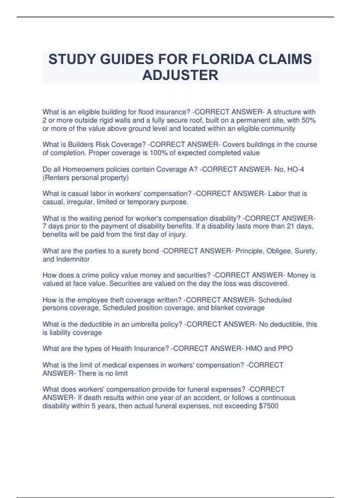 STUDY GUIDES FOR FLORIDA CLAIMS ADJUSTER What is an eligible building for flood insurance? -CORRECT ANSWER- A structure with 2 or more outside rigid walls and a fully secure roof, built on a permanent site, with 50% or more of the value above ground level and located within an eligible community What is Builders Risk Coverage? -CORRECT ANSWER- Covers buildings in the course of completion. Proper coverage is 100% of expected completed value Do all Homeowners policies contain Coverage A? -CORRECT ANSWER- No, HO-4 (Renters personal property) What is casual labor in workers' compensation? -CORRECT ANSWER- Labor that is casual, irregular, limited or temporary purpose. What is the waiting period for worker's compensation disability? -CORRECT ANSWER7 days prior to the payment of disability benefits. If a disability lasts more than 21 days, benefits will be paid from the first day of injury. What are the parties to a surety bond -CORRECT ANSWER- Principle, Obligee, Surety, and Indemnitor How does a crime policy value money and securities? -CORRECT ANSWER- Money is valued at face value. Securities are valued on the day the loss was discovered. How is the employee theft coverage written? -CORRECT ANSWER- Scheduled persons coverage, Scheduled position coverage, and blanket coverage What is the deductible in an umbrella policy? -CORRECT ANSWER- No deductible, this is liability coverage What are the types of Health Insurance? -CORRECT ANSWER- HMO and PPO What is the limit of medical expenses in workers' compensation? -CORRECT ANSWER- There is no limit What does workers' compensation provide for funeral expenses? -CORRECT ANSWER- If death results within one year of an accident, or follows a continuous disability within 5 years, then actual funeral expenses, not exceeding $7500 What is Ocean Marine coverage? -CORRECT ANSWER- Oldest form of insurance known. Covers perils associated with water transport. What is Inland Marine Coverage? -CORRECT ANSWER- Covers the cargo traveling overland, instead of by sea. What is "all risk" coverage in a homeowners policy? -CORRECT ANSWER- Property insurance covering loss arising from any fortuitous cause except those specifically excluded If you know how much Coverage A is in a Homeowners' policy, do you know how much Coverage B and C would be? -CORRECT ANSWER- Coverage B is automatically 10% of A and Coverage C is normally 50% of A. When is PIP available to the insured? -CORRECT ANSWER- PIP is available to an insured while occupying a motor vehicle or while injured as a pedestrian in the state of FL How does PIP deductible work? -CORRECT ANSWER- If an insured selects a deductible than that amount is always taken off the loss, even if its more than the PIP limit. What does occupying mean in regard to auto? -CORRECT ANSWER- means in, upon, getting in, on, out, or off of a vehicle In which coverage is the insurance company's promise to defend the insured? - CORRECT ANSWER- Liability Coverage What is excluded from auto liability coverage? -CORRECT ANSWER- intentional injury or damage, property owned or being transported by the insured, injuries to an employee while on the job, using a vehicle without the reasonable belief of permission. vehicle with less than 4 wheels Bodily Injury -CORRECT ANSWER- means physical harm and includes sickness, disease or death resulting from that physical harm. What vehicles are covered by a auto liability insurance? -CORRECT ANSWERRestricted to 4-wheel private passenger vehicles that are owned by the insured. What does the Miscellaneous Type Vehicle endorsement cover? -CORRECT ANSWER- covers equipment such as motor-homes, motorcycles, golf carts and allterrain vehicles. What coverage does Garage Insurance provide? -CORRECT ANSWER- specifically designed for those in the business of selling, servicing, repairing, or parking automobiles.