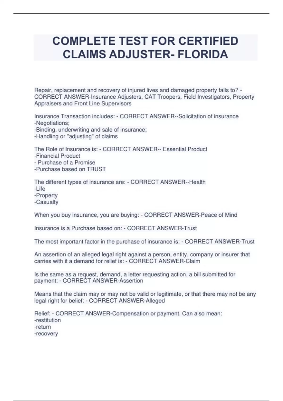 COMPLETE TEST FOR CERTIFIED CLAIMS ADJUSTER- FLORIDA Repair, replacement and recovery of injured lives and damaged property falls to? - CORRECT ANSWER-Insurance Adjusters, CAT Troopers, Field Investigators, Property Appraisers and Front Line Supervisors Insurance Transaction includes: - CORRECT ANSWER--Solicitation of insurance -Negotiations; -Binding, underwriting and sale of insurance; -Handling or "adjusting" of claims The Role of Insurance is: - CORRECT ANSWER-- Essential Product -Financial Product - Purchase of a Promise -Purchase based on TRUST The different types of insurance are: - CORRECT ANSWER--Health -Life -Property -Casualty When you buy insurance, you are buying: - CORRECT ANSWER-Peace of Mind Insurance is a Purchase based on: - CORRECT ANSWER-Trust The most important factor in the purchase of insurance is: - CORRECT ANSWER-Trust An assertion of an alleged legal right against a person, entity, company or insurer that carries with it a demand for relief is: - CORRECT ANSWER-Claim Is the same as a request, demand, a letter requesting action, a bill submitted for payment: - CORRECT ANSWER-Assertion Means that the claim may or may not be valid or legitimate, or that there may not be any legal right for belief: - CORRECT ANSWER-Alleged Relief: - CORRECT ANSWER-Compensation or payment. Can also mean: -restitution -return -recovery -replacement Takes form in property or money Third Party Claim: - CORRECT ANSWER-A claim made by a third party against an "insured" person or entity First Party Claim: - CORRECT ANSWER-A claim made by a policy holder against his/her own insurance company for recovery under the policy (contract) for which a premium has been paid Carrier's Claim Handling Goal #1: - CORRECT ANSWER-To help those who have been injured or who have suffered loss for which the insured is responsible or which is covered by the insurance contract Carrier's Claim Handling Goal #2: - CORRECT ANSWER-To minimize loss for the insured party and the carrier. To fairly evaluate the legitimacy and legality of a claim and its value and resolve satisfactory Carrier's Claim Handling Goal #3: - CORRECT ANSWER--To comply with the requirements of the law or terms of the insurance contract -To pay claims fairly and adequately Carrier's Claim Handling Goal #4: - CORRECT ANSWER-To maintain friendly and satisfactory relations between the injured party, the employer or policy holder, the insurance company an the public Carrier's Claim Handling Goal #5: - CORRECT ANSWER-To satisfy the company's moral and ethical obligation to the public and conduct business (claims) in a friendly, helpful manner An individual who, for compensation, fee or commission, investigates and settles claims arising under property, casualty or surety contracts on behalf of the insurer or the insured: - CORRECT ANSWER-Adjuster The process, or art, of investigating, evaluating, reporting on, negotiating and resolving claims under a policy, or claims against your client, the insurance company or the company for which you work or represent: - CORRECT ANSWER-Adjusting Types of Adjusters: - CORRECT ANSWER--Staff Adjusters -Independent Adjusters - Public Adjusters Work for Insurance Companies: - CORRECT ANSWER-Staff Adjusters Self Employed or employed by an independent adjusting firm: - CORRECT ANSWERIndependent Adjusters Represents the insured, typically seen in the property lines of business: - CORRECT ANSWER-Public Adjusters Can be inside adjusters, field adjusters or both: - CORRECT ANSWER-Property Adjusters Property Adjusters handle: - CORRECT ANSWER--ONLY physical damage claims -Automobile Physical Damages Claims -Damages to homes, buildings, personal property Evaluate legal liability, cause of loss, damages and bodily injury: - CORRECT ANSWER-Liability Adjusters Provide medial and wage replacement benefits for injured workers - CORRECT ANSWER-Worker's Compensation Adjusters Handle various types of losses and may earn the right to a field position: - CORRECT ANSWER-Multi-Line Adjusters Insurance that is compromised of liability and worker's compensation claims: - CORRECT ANSWER-Casualty Insurance Involves relative degrees of legal responsibility, the evaluation of damage or injury and determination of legal rights and remedies: - CORRECT ANSWER-Casualty Claims Adjusting Liability and Worker's Compensation Adjusters do most of the following: - CORRECT ANSWER--Verify coverage -Investigate facts by securing testimony and evidence -Determine liability - Determine the amount of loss in terms of property damage, medical expenses, loss of wage, etc. -Determine intangibles, such as pain and suffering, discomfort and inconvenience -Determine if litigation is eminent and estimate defense costs and the probability of success in the event of a law suit -Determine if other parties to the loss might be responsible under any one of a number of legal theories -Pay claims or benefits as owed under various theories of liability or statute Property Claims Adjusting is: - CORRECT ANSWER-The evaluation of damage to real or personal property resulting from various perils such as: -fire -wind -theft -explosion An assessment of available policy limits for each involved peril A determination of how much should be paid under policy Property Adjusters do the following: - CORRECT ANSWER--Verify coverage -Investigate the facts of loss to determine the proximate cause of loss -Verify if the policy covers the involved peril -Assist the insured in mitigating the loss by providing assistance and guidance -Determine the extent of damage and the cost to repair or replaced damage property -Verify the insured's "insurable interest" in the property, as well as that of the mortgage What umbrella does Automobile Physical Damage Adjusting fall under? - CORRECT ANSWER-Property Adjusting Automobile Physical Damage Adjusting deals with: - CORRECT ANSWER-handling and resolution of claims for collision, comprehensive and mechanical breakdown Automobile Physical Damage Adju