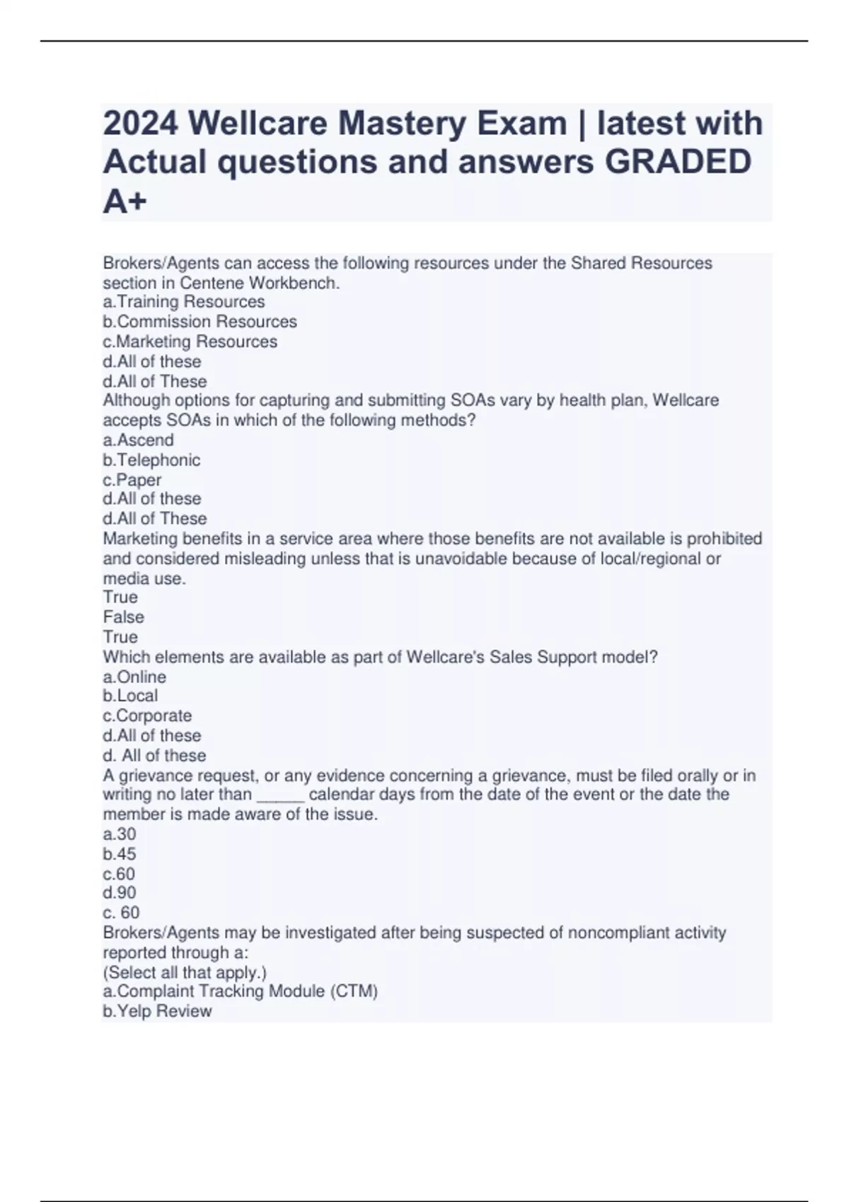 2024 Wellcare Mastery Exam | latest with Actual questions and answers GRADED A+ Brokers/Agents can access the following resources under the Shared Resources section in Centene Workbench. a.Training Resources b.Commission Resources c.Marketing Resources d.All of these d.All of These Although options for capturing and submitting SOAs vary by health plan, Wellcare accepts SOAs in which of the following methods? a.Ascend b.Telephonic c.Paper d.All of these d.All of These Marketing benefits in a service area where those benefits are not available is prohibited and considered misleading unless that is unavoidable because of local/regional or media use. True False True Which elements are available as part of Wellcare's Sales Support model? a.Online b.Local c.Corporate d.All of these d. All of these A grievance request, or any evidence concerning a grievance, must be filed orally or in writing no later than _____ calendar days from the date of the event or the date the member is made aware of the issue. a.30 b.45 c.60 d.90 c. 60 Brokers/Agents may be investigated after being suspected of noncompliant activity reported through a: (Select all that apply.) a.Complaint Tracking Module (CTM) b.Yelp Review c.Grievance d.Secret Shop Finding a.Complaint Tracking Module (CTM) c.Grievance d.Secret Shop Finding Brokers/Agents can submit a support ticket online through their Centene Workbench portal. True False True When an enrollment application is completed in Ascend, brokers/agents can complete a Health Risk As