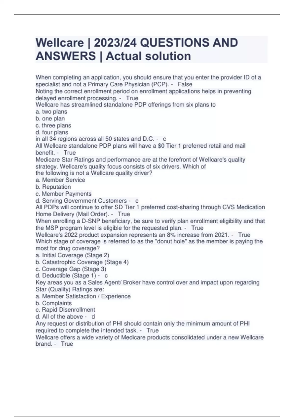 Wellcare | 2023/24 QUESTIONS AND ANSWERS | Actual solution When completing an application, you should ensure that you ente r the provider ID of a specialist and not a Primary Care Physician (PCP). - False Noting the correct enrollment period on enrollment applications helps in preventing delayed enrollment processing. - True Wellcare has streamlined standalone PDP offering s from six plans to a. two plans b. one plan c. three plans d. four plans in all 34 regions across all 50 states and D.C. - c All Wellcare standalone PDP plans will have a $0 Tier 1 preferred retail and mail benefit. - True Medicare Star Ratings a nd performance are at the forefront of WelIcare's quality strategy. Wellcare's quality focus consists of six drivers. Which of the following is not a Wellcare quality driver? a. Member Service b. Reputation c. Member Payments d. Serving Government Cus tomers - c All PDPs will continue to offer SD Tier 1 preferred cost -sharing through CVS Medication Home Delivery (Mail Order). - True When enrolling a D -SNP beneficiary, be sure to verify plan enrollment eligibility and that the MSP program level is el igible for the requested plan. - True Wellcare's 2022 product expansion represents an 8% increase from 2021. - True Which stage of coverage is referred to as the "donut hole" as the member is paying the most for drug coverage? a. Initial Coverage (Stage 2) b. Catastrophic Coverage (Stage 4) c. Coverage Gap (Stage 3) d. Deductible (Stage 1) - c Key areas you as a Sales Agent/ Broker have control over and impact upon regarding Star (Quality) Ratings are: a. Member Satisfacti on / Experience b. Complaints c. Rapid Disenrollment d. All of the above - d Any request or distribution of PHI should contain only the minimum amount of PHI required to complete the intended task. - True Wellcare offers a wide variety of Medicare p roducts consolidated under a new Wellcare brand. - True
