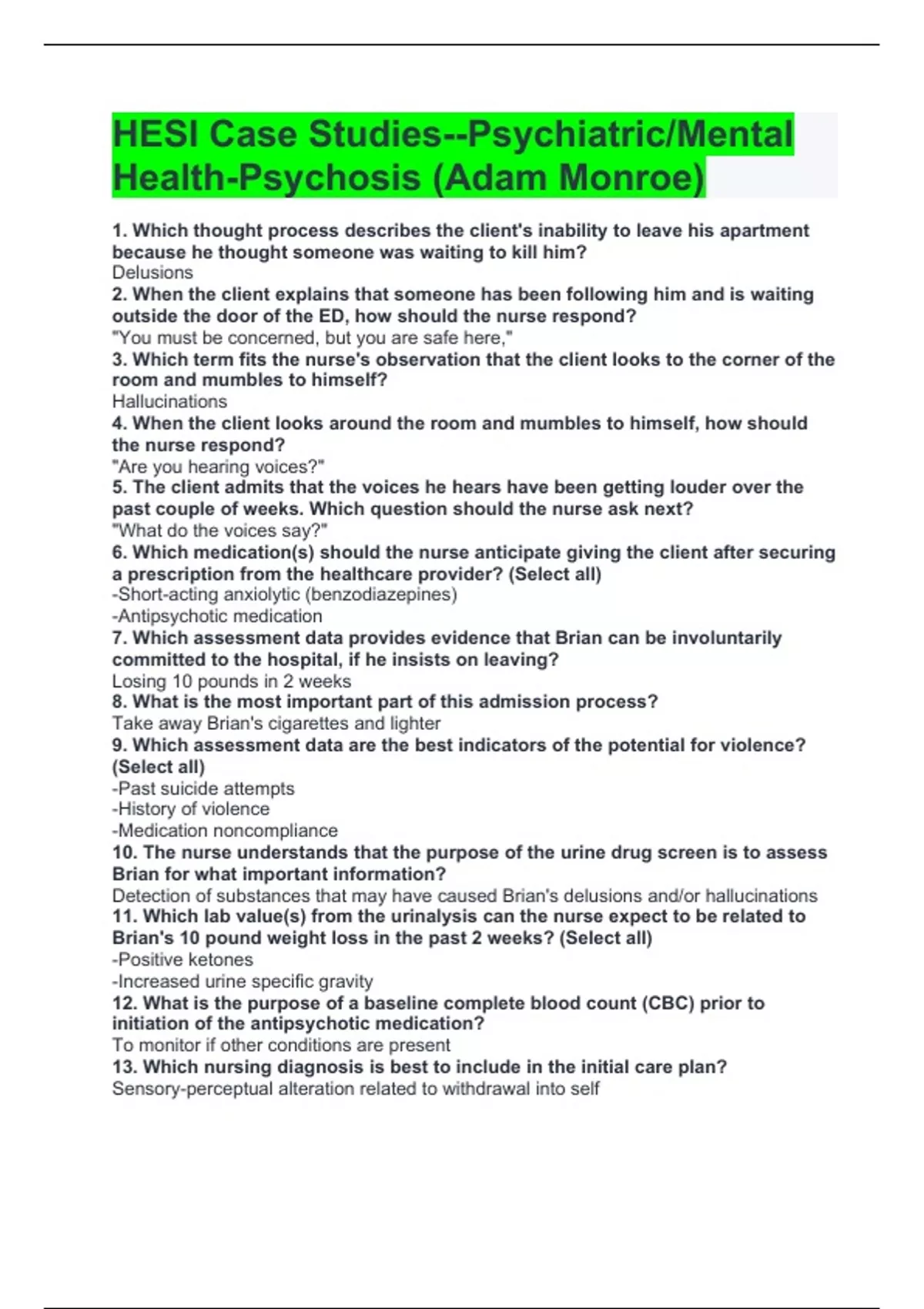 HESI Case Studies--Psychiatric/Mental Health-Psychosis (Adam Monroe) 1. Which thought process describes the client's inability to leave his apartment because he thought someone was waiting to kill him? Delusions 2. When the client explains that someone has been following him and is waiting outside the door of the ED, how should the nurse respond? "You must be concerned, but you are safe here," 3. Which term fits the nurse's observation that the client looks to the corner of the room and mumbles to himself? Hallucinations 4. When the client looks around the room and mumbles to himself, how should the nurse respond? "Are you hearing voices?" 5. The client admits that the voices he hears have been getting louder over the past couple of weeks. Which question should the nurse ask next? "What do the voices say?" 6. Which medication(s) should the nurse anticipate giving the client after securing a prescription from the healthcare provider? (Select all) -Short-acting anxiolytic (benzodiazepines) -Antipsychotic medication 7. Which assessment data provides evidence that Brian can be involuntarily committed to the hospital, if he insists on leaving? Losing 10 pounds in 2 weeks 8. What is the most important part of this admission process? Take away Brian's cigarettes and lighter 9. Which assessment data are the best indicators of the potential for violence? (Select all) -Past suicide attempts -History of violence -Medication noncompliance 10. The nurse understands that the purpose of the urine drug screen is to assess Brian for what important information? Detection of substances that may have caused Brian's delusions and/or hallucinations 11. Which lab value(s) from the urinalysis can the nurse expect to be related to Brian's 10 pound weight loss in the past 2 weeks? (Select all) -Positive ketones -Increased urine specific gravity 12. What is the purpose of a baseline complete blood count (CBC) prior to initiation of the antipsychotic medication? To monitor if other conditions are present 13. Which nursing diagnosis is best to include in the initial care plan? Sensory-perceptual alteration related to withdrawal into self