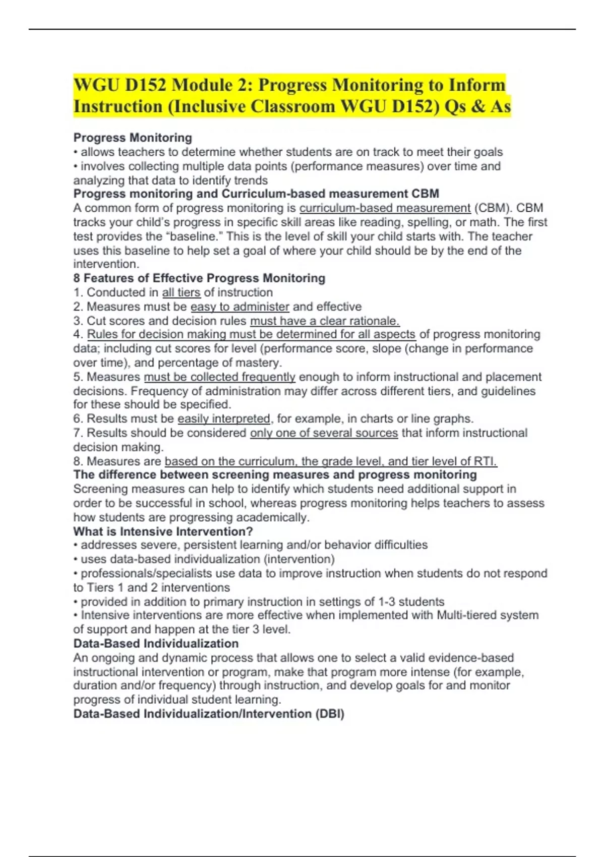 WGU D152 Module 2: Progress Monitoring to Inform Instruction (Inclusive Classroom WGU D152) Qs & As Progress Monitoring • allows teachers to determine whether students are on track to meet their goals • involves collecting multiple data points (performance measures) over time and analyzing that data to identify trends Progress monitoring and Curriculum-based measurement CBM A common form of progress monitoring is curriculum-based measurement (CBM). CBM tracks your child’s progress in specific skill areas like reading, spelling, or math. The first test provides the “baseline.” This is the level of skill your child starts with. The teacher uses this baseline to help set a goal of where your child should be by the end of the intervention. 8 Features of Effective Progress Monitoring 1. Conducted in all tiers of instruction 2. Measures must be easy to administer and effective 3. Cut scores and decision rules must have a clear rationale. 4. Rules for decision making must be determined for all aspects of progress monitoring data; including cut scores for level (performance score, slope (change in performance over time), and percentage of mastery. 5. Measures must be collected frequently enough to inform instructional and placement decisions. Frequency of administration may differ across different tiers, and guidelines for these should be specified. 6. Results must be easily interpreted, for example, in charts or line graphs. 7. Results should be considered only one of several sources that inform instructional decision making. 8. Measures are based on the c