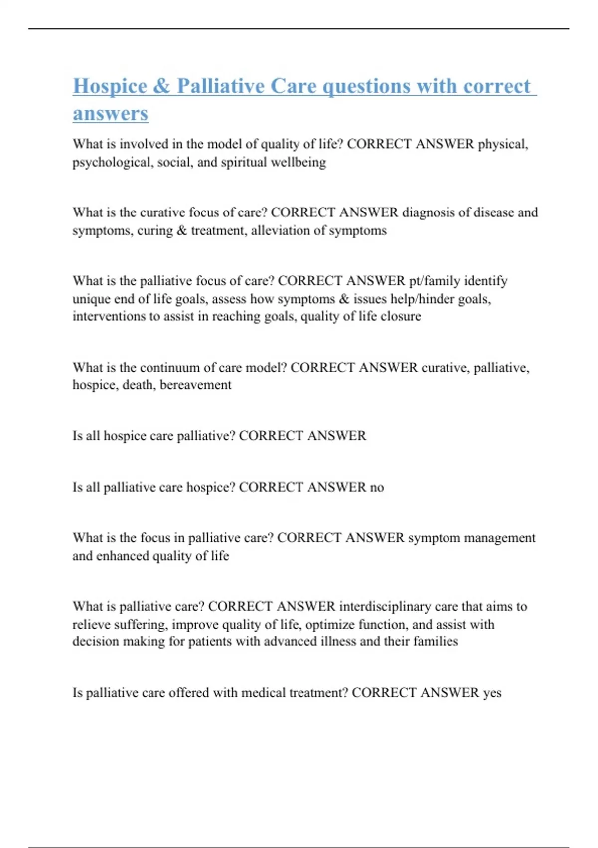 What is involved in the model of quality of life? CORRECT ANSWER physical, psychological, social, and spiritual wellbeing What is the curative focus of care? CORRECT ANSWER diagnosis of disease and symptoms, curing & treatment, alleviation of symptoms What is the palliative focus of care? CORRECT ANSWER pt/family identify unique end of life goals, assess how symptoms & issues help/hinder goals, interventions to assist in reaching goals, quality of life closure What is the continuum of care model? CORRECT ANSWER curative, palliative, hospice, death, bereavement Is all hospice care palliative? CORRECT ANSWER Is all palliative care hospice? CORRECT ANSWER no What is the focus in palliative care? CORRECT ANSWER symptom management and enhanced quality of life What is palliative care? CORRECT ANSWER interdisciplinary care that aims to relieve suffering, improve quality of life, optimize function, and assist with decision making for patients with advanced il