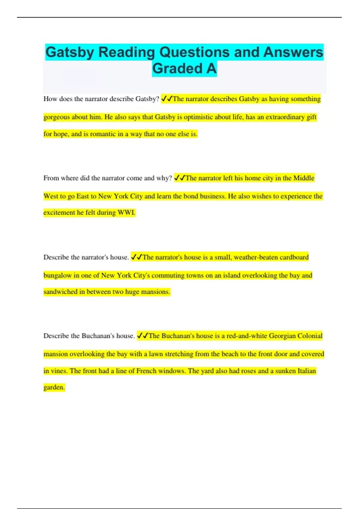 How does the narrator describe Gatsby? The narrator describes Gatsby as having something gorgeous about him. He also says that Gatsby is optimistic about life, has an extraordinary gift for hope, and is romantic in a way that no one else is. From where did the narrator come and why? The narrator left his home city in the Middle West to go East to New York City and learn the bond business. He also wishes to experience the excitement he felt during WWI. Describe the narrator's house. The narrator's house is a small, weather-beaten cardboard bungalow in one of New York City's commuting towns on an island overlooking the bay and sandwiched in between two huge mansions. Describe the Buchanan's house. The Buchanan's house is a red-and-white Georgian Colonial mansion overlooking the bay with a lawn stretching from the beach to the front door and covered in vines. The front had a line of French windows. The yard also had roses and a sunken Italian garden. How does Nick know Daisy and Tom? Nick knew Tom in college and Daisy was his second cousin once removed. Describe Tom. What is our impression of him in Chapter 1? Tom is a huge guy who was previously one of the most powerful ends that ever played football as New Haven. He is a sturdy straw-haired man of thirty with a hard mouth, arrogant eyes, and power body. He has always been wealthy, and seems to be a somewhat cruel man, very opinionated, and judgement. Upon first impression, he doesn't seem to be very likable. What kind of person is Daisy? Daisy is a kind and charming person who is engaging and makes people feel like there is no one that she would rather see. She seems to be a happy person while also having an underlying sadness to her. Having bright eyes, a passionate mouth, and a face full of excitement, she has a certain innocence to her. She seems to fake a lot of her innocence though. What did Miss Baker tell Nick about Tom? Miss Baker tells Nick that Tom has a mistress in New York City. On pg. 2, when introducing his story, the narrator talks about why he left the East (meaning that after all of the novel's events happen, the narrator leaves). How does he seem to feel about the
