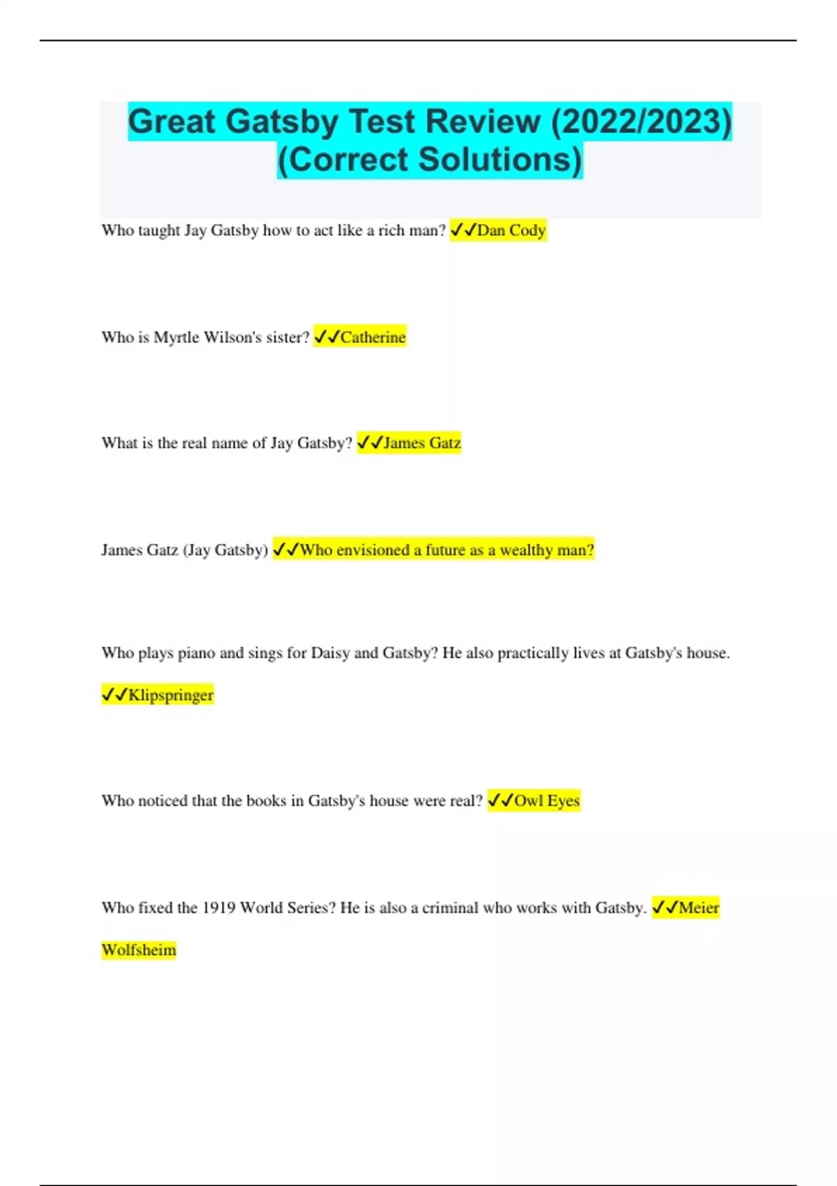 great gatsby test review correct solu