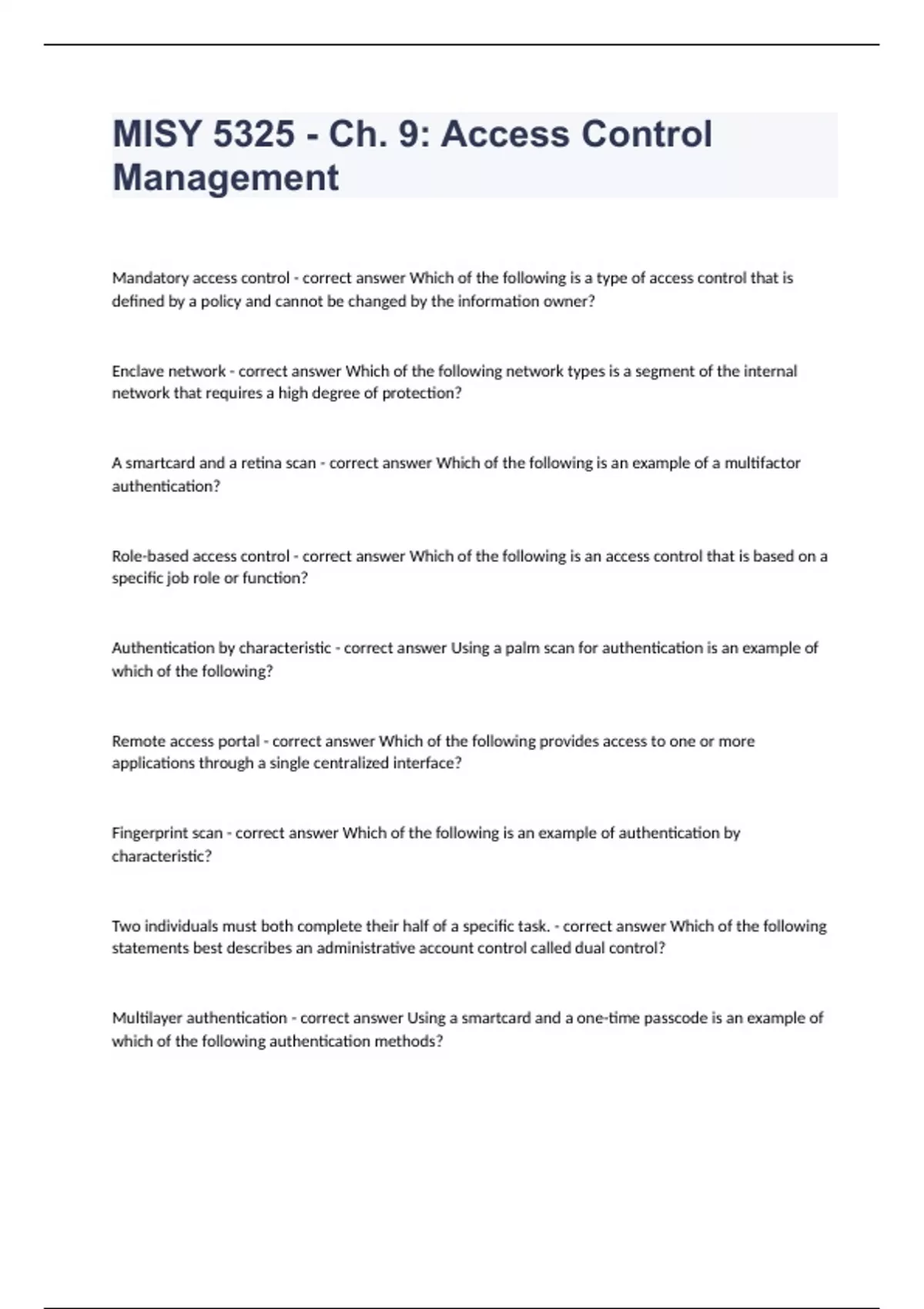 MISY 5325 - Ch. 9 Access Control Management Mandatory access control - correct answer Which of the following is a type of access control that is defined by a policy and cannot be changed by the information owner? Enclave network - correct answer Which of the following network types is a segment of the internal network that requires a high degree of protection? A smartcard and a retina scan - correct answer Which of the following is an example of a multifactor authentication? Role-based access control - correct answer Which of the following is an access control that is based on a specific job role or function? Authentication by characteristic - correct answer Using a palm scan for authentication is an example of which of the following? Remote access portal - correct answer Which of the following provides access to one or more applications through a single centralized interface? Fingerprint scan - correct answer Which of the following is an example of authentication by characteristic? Two individuals must both complete their half of a specific task. - correct answer Which of the following statements best describes an administrative account control called dual control? Multilayer authentication - correct answer Using a smartcard and a one-time passcode is an example of which of the following authentication methods? Access controls - correct answer security features that govern how users and processes communicate and interact with systems and resources The primary objective of access controls is to - correct answer protect information and information systems from unauthorized access (confidentiality), modification (integrity), or disruption (availability). subject - correct answer the active entity (that is, the user or system) that requests access to a resource or data object - correct answer the passive entity being accessed or being acted upon the three common attributes of all access controls - correct answer • An identification scheme • an authentication method • an authorization model identification scheme - correct answer used to identify unique records in a set, such as a username Identification - correct answer process of the subject supplying an identifier to the object authentication method - correct answer how identification is proven to be genuine Authentication - correct answer the process of the subject supplying verifiable credentials to the object Authorization - correct answer the process of assigning authenticated subjects the permission to carry out a specific operation. identity management - correct answer The process for identifying, authenticating and authorizing users or groups of users to have access to applications, systems or networks