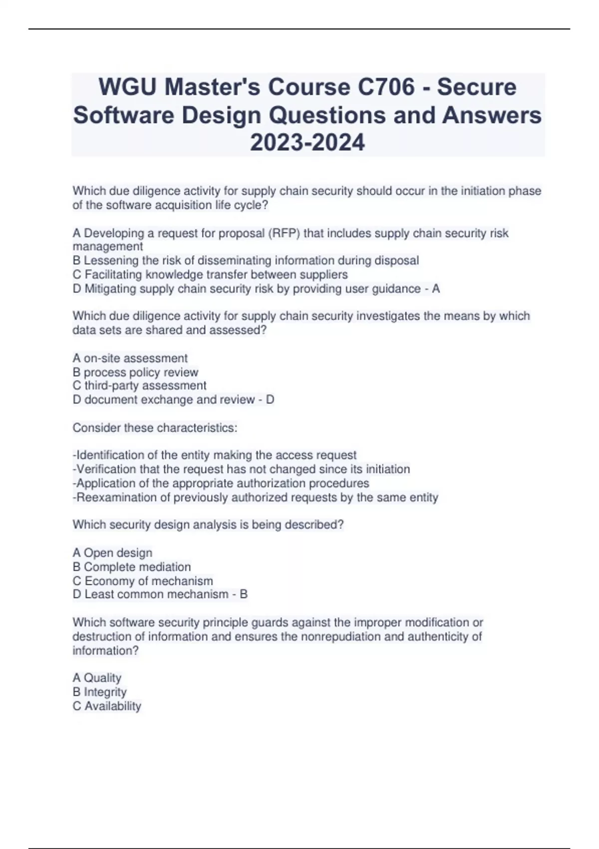 WGU Master's Course C706 - Secure Software Design Questions and Answers