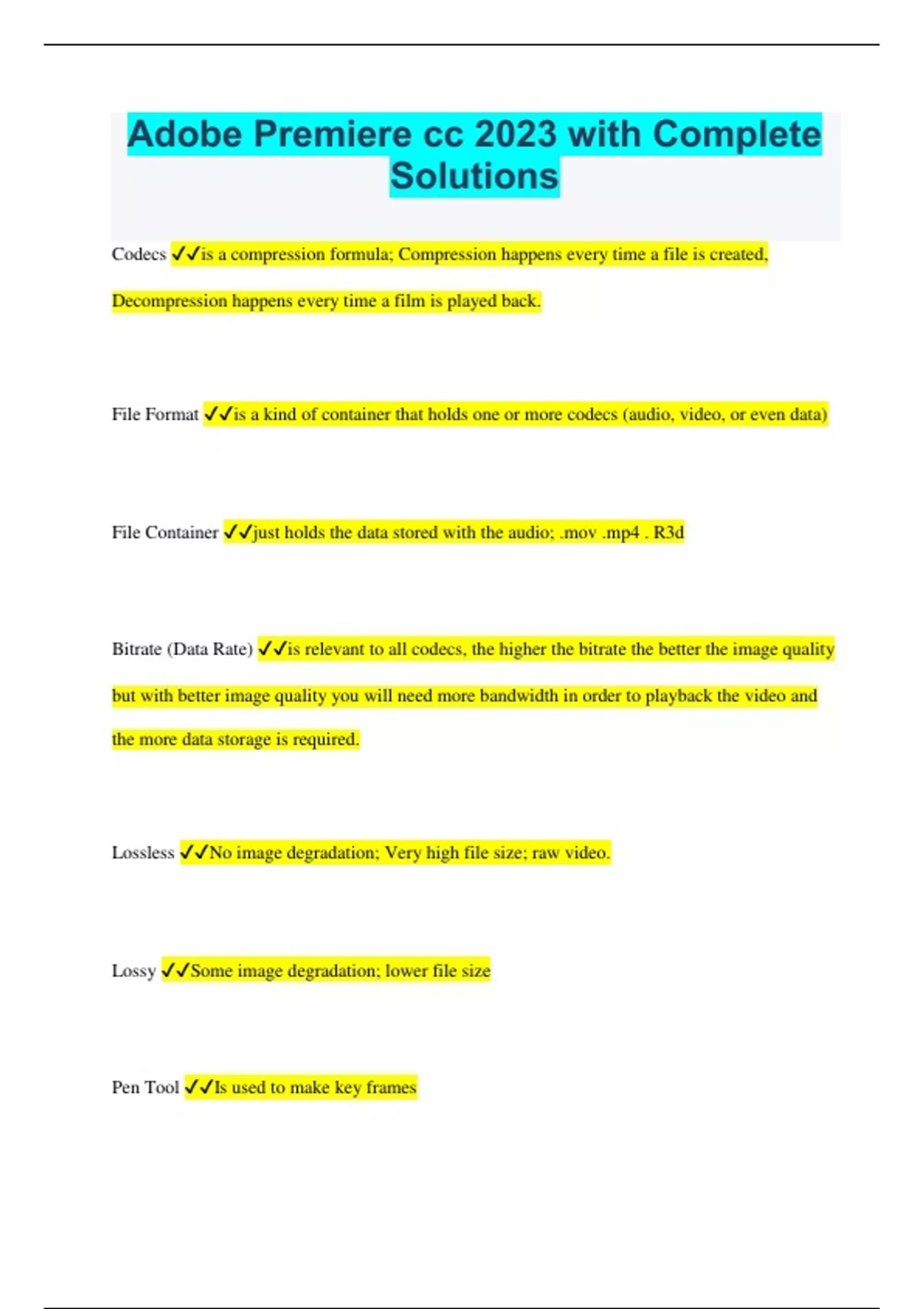 Adobe Premiere cc 2023 with Complete Solutions Codecs is a compression formula; Compression happens every time a file is created, Decompression happens every time a film is played back. File Format is a kind of container that holds one or more codecs (audio, video, or even data) File Container just holds the data stored with the audio; .mov .mp4 . R3d Bitrate (Data Rate) is relevant to all codecs, the higher the bitrate the better the image quality but with better image quality you will need more bandwidth in order to playback the video and the more data storage is required. Lossless No image degradation; Very high file size; raw video. Lossy Some image degradation; lower file size Pen Tool Is used to make key frames Keys J K & L Used to play forward backward and pause Match Source Opens source clip (key command F') Key command I and O Used to mark in and out points X command Clears in and out points Option I Clears the individual in point Option O Clears the individual out point Plus and minus key Used to zoom in and out of timeline Time code Left side; blue number of adobe premiere In & out duration Located on the right side of premiere S Plays only the track that is solo Left and right arrows Moves one frame at a time Up and down arrows Goes to one edit to the next How would you add an effect to many instances to the same clip scattered throughout the timeline Add effect to master clip Track select forward tool Selects everything forward that you click. Ripple Tool Allows you to adjust the clip, extend or reduce it. Slip Tool Allows you to choose a different section of a clip while keeping the same duration/ placement in a clip at a time. Slide Tool Extends and overwrites adjustment clips Rate Stretch Tool Compress and stretch clips in your timeline; making it speed up or slow down. Q & W keys Makes a ripple edit. Razor blade tool Allows you to split clips, except locked tracks; command key C is for this tool Source Panel A window you can playback media in Project panel Where your clips in your timeline is projected. Roll edit tool Allows you to move an edit without affecting the rest of the timeline.