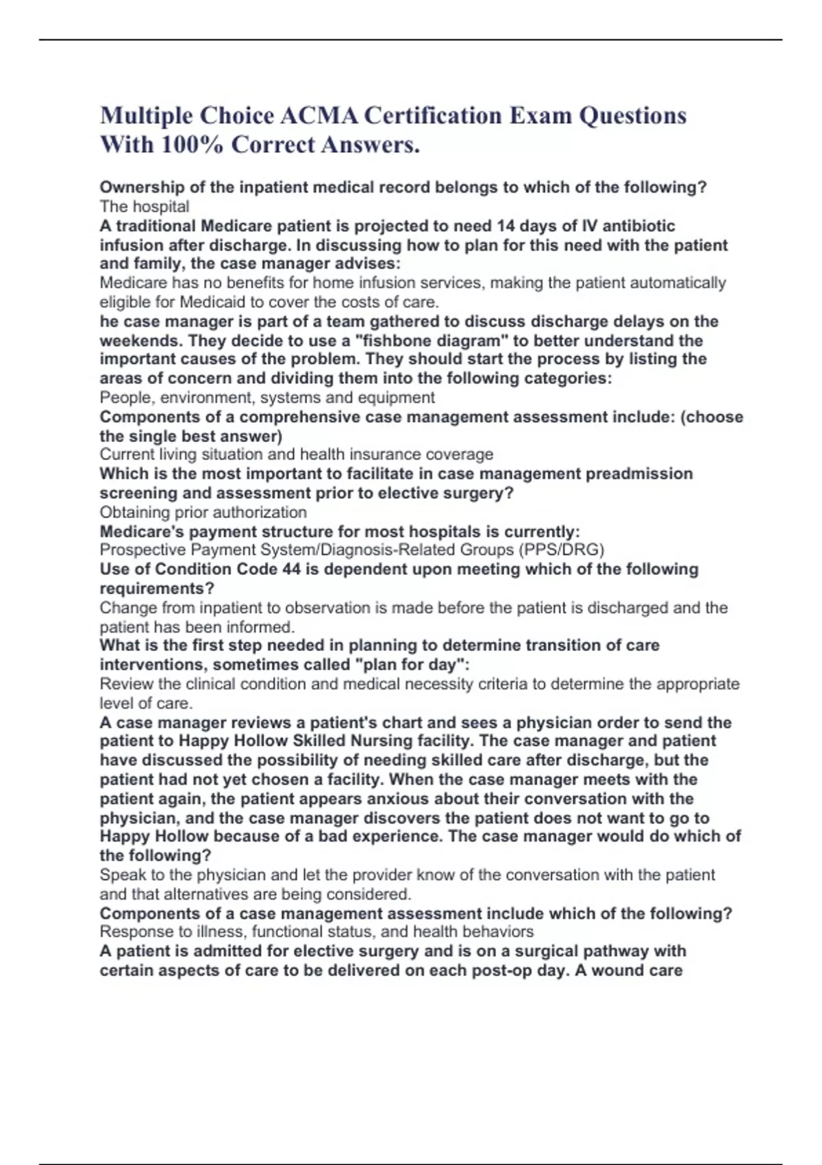 Multiple Choice ACMA Certification Exam Questions With 100% Correct Answers. Ownership of the inpatient medical record belongs to which of the following? The hospital A traditional Medicare patient is projected to need 14 days of IV antibiotic infusion after discharge. In discussing how to plan for this need with the patient and family, the case manager advises: Medicare has no benefits for home infusion services, making the patient automatically eligible for Medicaid to cover the costs of care. he case manager is part of a team gathered to discuss discharge delays on the weekends. They decide to use a "fishbone diagram" to better understand the important causes of the problem. They should start the process by listing the areas of concern and dividing them into the following categories: People, environment, systems and equipment Components of a comprehensive case management assessment include: (choose the single best answer) Current living situation and health insurance coverage Which is the most important to facilitate in case management preadmission screening and assessment prior to elective surgery? Obtaining prior authorization