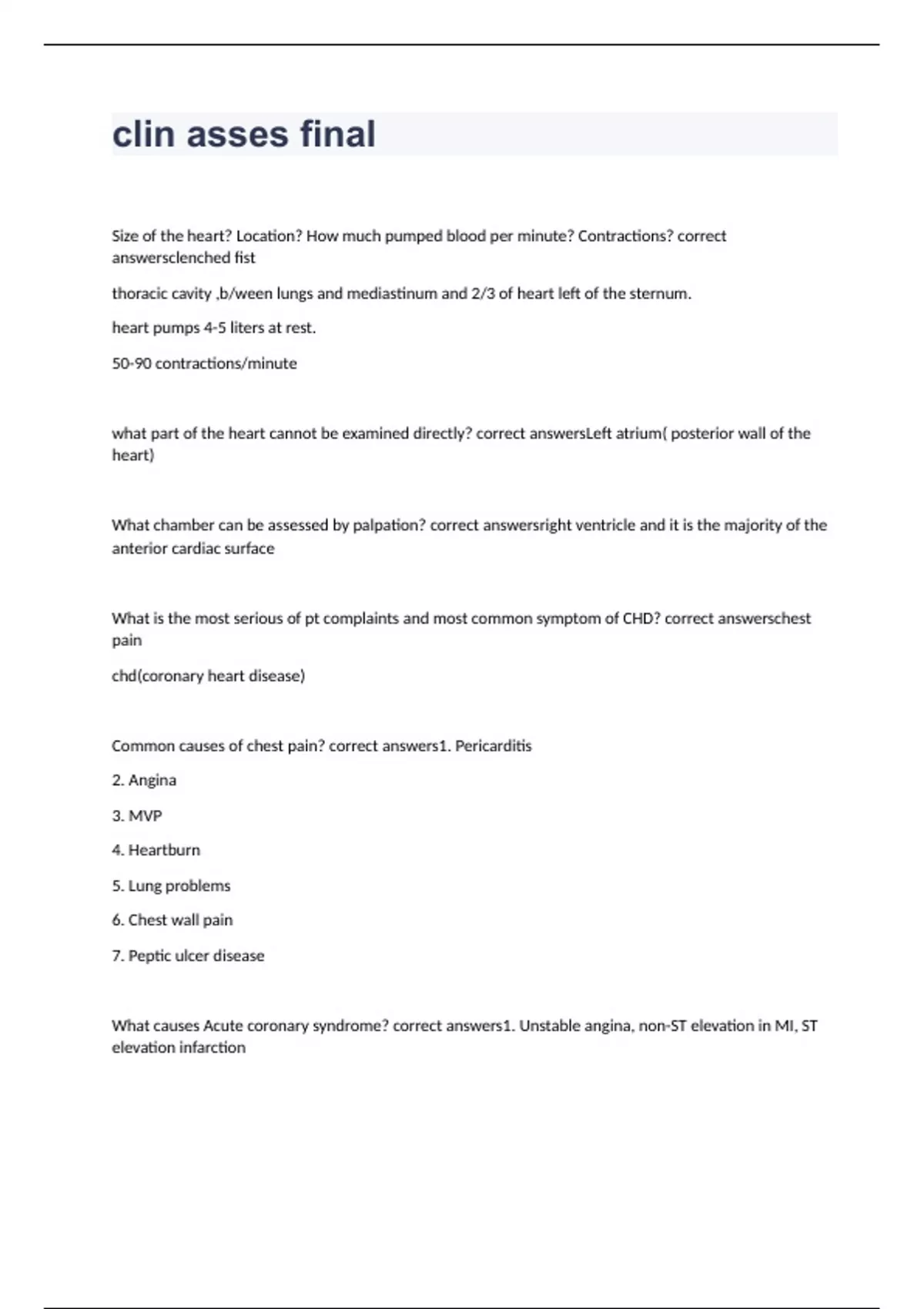 Size of the heart? Location? How much pumped blood per minute? Contractions? correct answersclenched fist thoracic cavity ,b/ween lungs and mediastinum and 2/3 of heart left of the sternum. heart pumps 4-5 liters at rest. 50-90 contractions/minute what part of the heart cannot be examined directly? correct answersLeft atrium( posterior wall of the heart) What chamber can be assessed by palpation? correct answersright ventricle and it is the majority of the anterior cardiac surface What is the most serious of pt complaints and most common symptom of CHD? correct answerschest pain chd(coronary heart disease) Common causes of chest pain? correct answers1. Pericarditis 2. Angina 3. MVP 4. Heartburn 5. Lung problems 6. Chest wall pain 7. Peptic ulcer disease What causes Acute coronary syndrome? correct answers1. Unstable angina, non-ST elevation in MI, ST elevation infarction