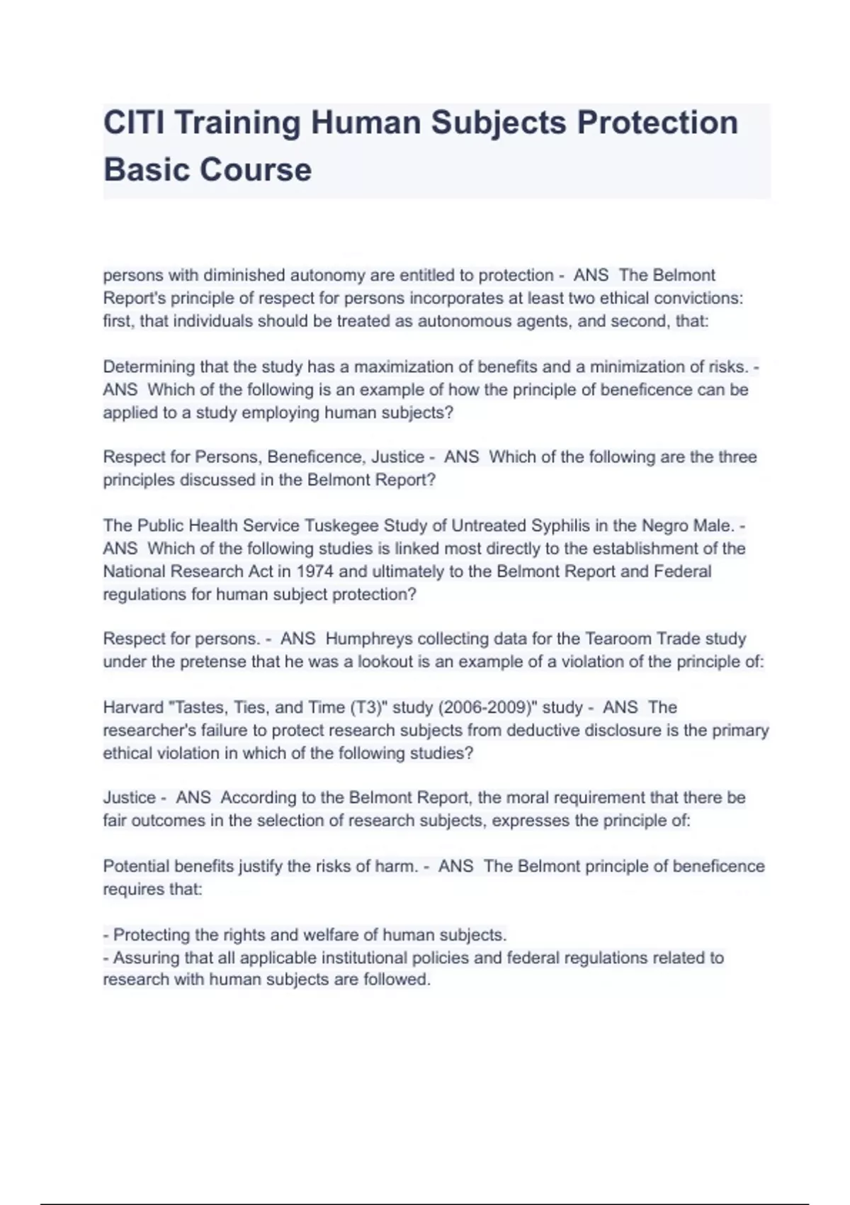 CITI Training Human Subjects Protection Basic Course Exam Questions And Answers persons with diminished autonomy are entitled to protection - ANS The Belmont Report's principle of respect for persons incorporates at least two ethical convictions: first, that individuals should be treated as autonomous agents, and second, that: Determining that the study has a maximization of benefits and a minimization of risks. - ANS Which of the following is an example of how the principle of beneficence can be applied to a study employing human subjects? Respect for Persons, Beneficence, Justice - ANS Which of the following are the three principles discussed in the Belmont Report? The Public Health Service Tuskegee Study of Untreated Syphilis in the Negro Male. - ANS Which of the following studies is linked most directly to the establishment of the National Research Act in 1974 and ultimately to the Belmont Report and Federal regulations for human subject protection? Respect for persons. - ANS Humphreys collecting data for the Tearoom Trade study under the pretense that he was a lookout is an example of a violation of the principle of: Harvard "Tastes, Ties, and Time (T3)" study ()" study - ANS The researcher's failure to protect research subjects from deductive disclosure is the primary ethical violation in which of the following studies? Justice - ANS According to the Belmont Report, the moral requirement that there be fair outcomes in the selection of research subjects, expresses the principle of: Potential benefits justify the risks of harm. - ANS The Belmont principle of beneficence requires that: