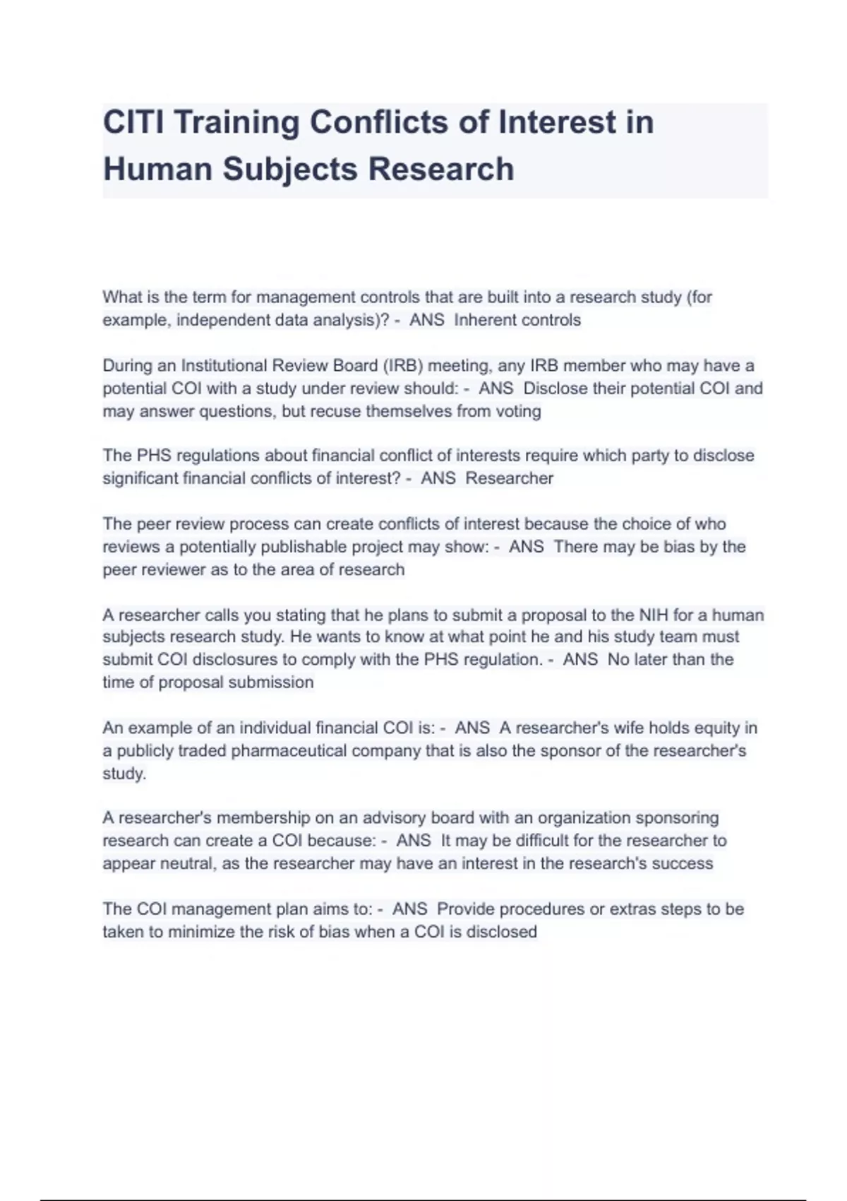 CITI Training Conflicts of Interest in Human Subjects Research What is the term for management controls that are built into a research study (for example, independent data analysis)? - ANS Inherent controls During an Institutional Review Board (IRB) meeting, any IRB member who may have a potential COI with a study under review should: - ANS Disclose their potential COI and may answer questions, but recuse themselves from voting The PHS regulations about financial conflict of interests require which party to disclose significant financial conflicts of interest? - ANS Researcher The peer review process can create conflicts of interest because the choice of who reviews a potentially publishable project may show: - ANS There may be bias by the peer reviewer as to the area of research A researcher calls you stating that he plans to submit a proposal to the NIH for a human subjects research study. He wants to know at what point he and his study team must submit COI disclosures to comply with the PHS regulation. - ANS No later than the time of proposal submission An example of an individual financial COI is: - ANS A researcher's wife holds equity in a publicly traded pharmaceutical company that is also the sponsor of the researcher's study.