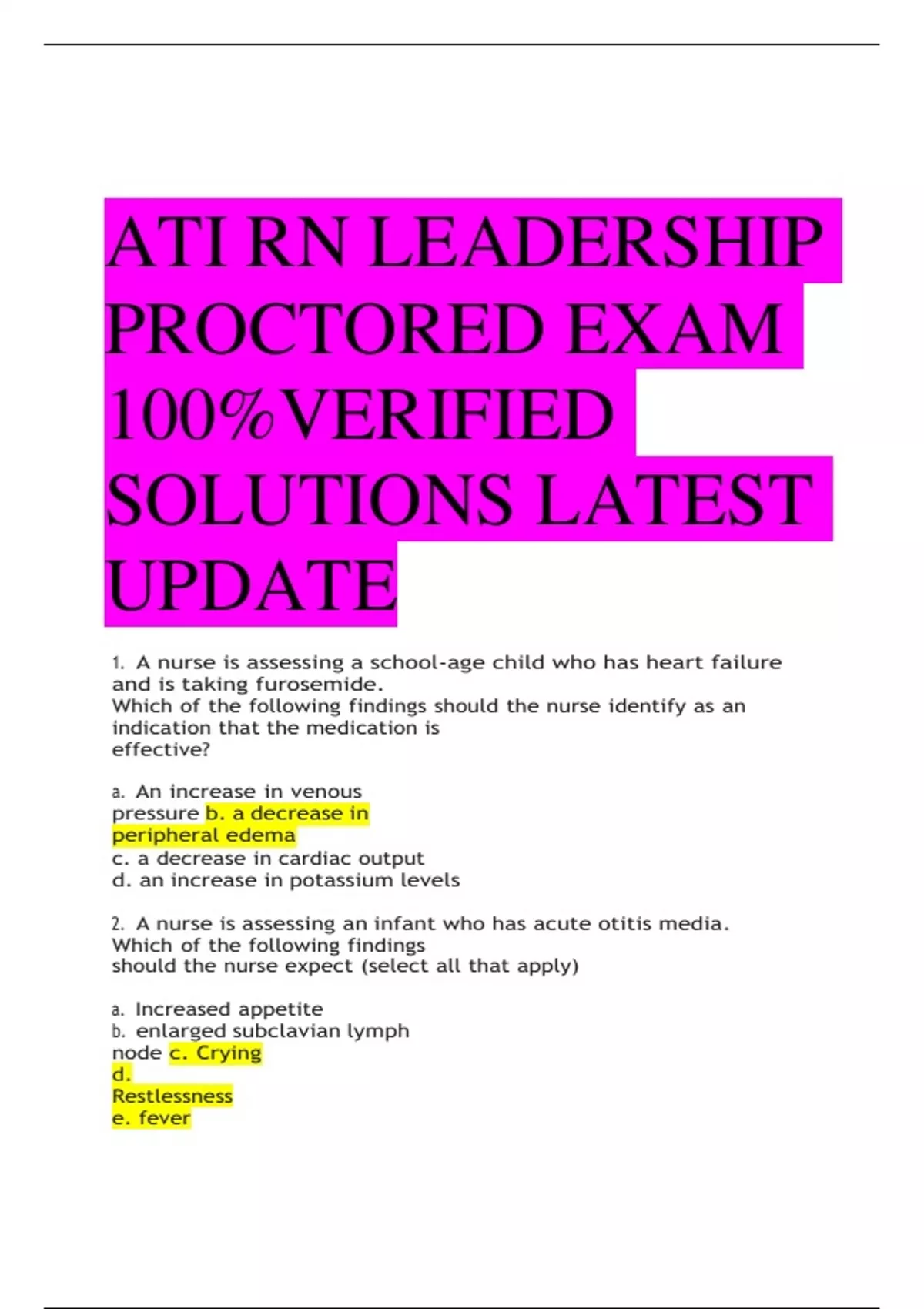 ATI RN LEADERSHIP PROCTORED EXAM 100%VERIFIED SOLUTIONS LATEST UPDATE 1. A nurse is assessing a school-age child who has heart failure and is taking furosemide. Which of the following findings should the nurse identify as an indication that the medication is effective? a. An increase in venous pressure b. a decrease in peripheral edema c. a decrease in cardiac output d. an increase in potassium levels 2. A nurse is assessing an infant who has acute otitis media. Which of the following findings should the nurse expect (select all that apply) a. Increased appetite b. enlarged subclavian lymph node c. Crying d. Restlessness e. fever 3. a nurse is providing teaching to the parents of an infant who is to undergo pilocarpine lontophoresis Testing for Cystic Fibrosis. Which of the following statements should the nurse include in the teaching? a. We will measure the amount of protein in your baby's urine over 24 hour period b. The test will measure the amount of water in your baby’s sweat c. a nurse will insert an IV prior to the test d. your baby will need to fast for 8 hours prior to the test 4. A nurse in an urgent care clinic is prioritizing care for children. Which of the following children should the nurse assess first? a. A toddler who has nephrotic syndrome and facial edema b. a preschool-age child who has a muffled voice and no spontaneous cough c. a preschool-age child who has diabetes mellitus and a blood glucose of 200 mg/dL d. an adolescent who has Crohn's disease and recent weight loss of 5kg mg (11 lb) 5 .A nurse is providing teaching to the parents of a toddler who is to undergo a sweat chloride test. Which of the following statements should the nurse include? a. The purpose of the test is to determine if your child has Crohn's disease b. the technician will use a device to produce an electrical current during the test c. during the test, your child will be in a room that is cold d. your child sweat will be collected over 24 hours 6. A nurse in the emergency department is caring for an adolescent who is requesting testing for STI. Which of the following action is appropriate for the nurse to take? a. Request verbal consent from the social worker b. contact the client's parents to obtain phone consent c. postpone the testing until the client's parents are present d. obtain written consent from the client 7. A nurse in the emergency department