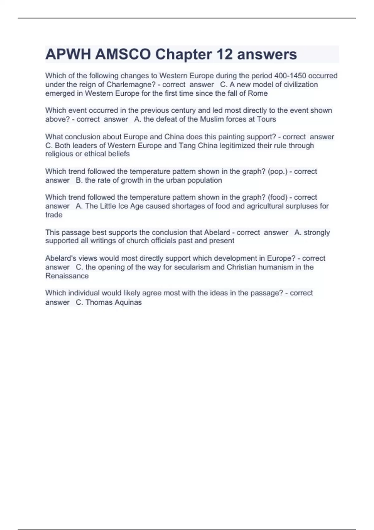 APWH AMSCO Chapter 12 answers Question and answers 2023/2024 verified to pass Which of the following changes to Western Europe during the period 400-1450 occurred under the reign of Charlemagne? - correct answer C. A new model of civilization emerged in Western Europe for the first time since the fall of Rome Which event occurred in the previous century and led most directly to the event shown above? - correct answer A. the defeat of the Muslim forces at Tours What conclusion about Europe and China does this painting support? - correct answer C. Both leaders of Western Europe and Tang China legitimized their rule through religious or ethical beliefs Which trend followed the temperature pattern shown in the graph? (pop.) - correct answer B. the rate of growth in the urban population Which trend followed the temperature pattern shown in the graph? (food) - correct answer A. The Little Ice Age caused shortages of food and agricultural surpluses for trade