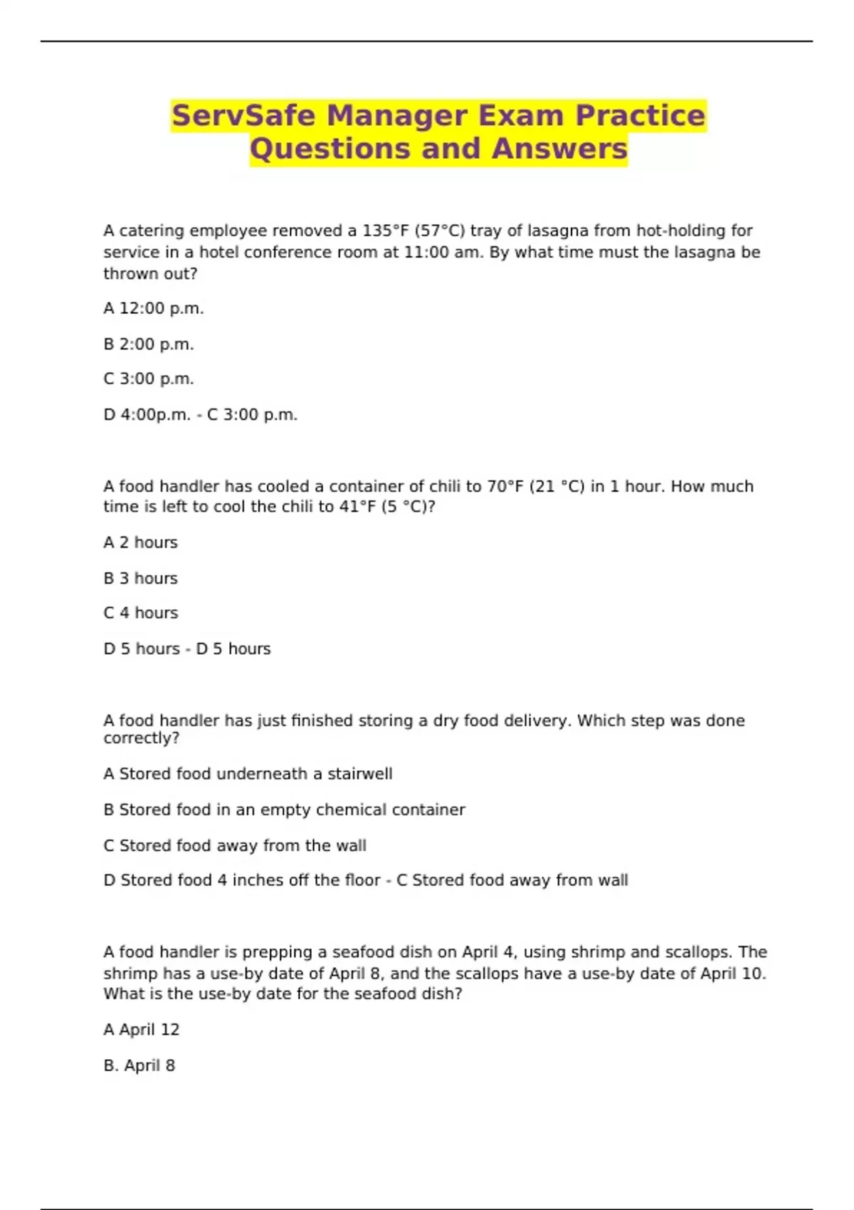 ServSafe Manager Exam Practice Questions and Answers