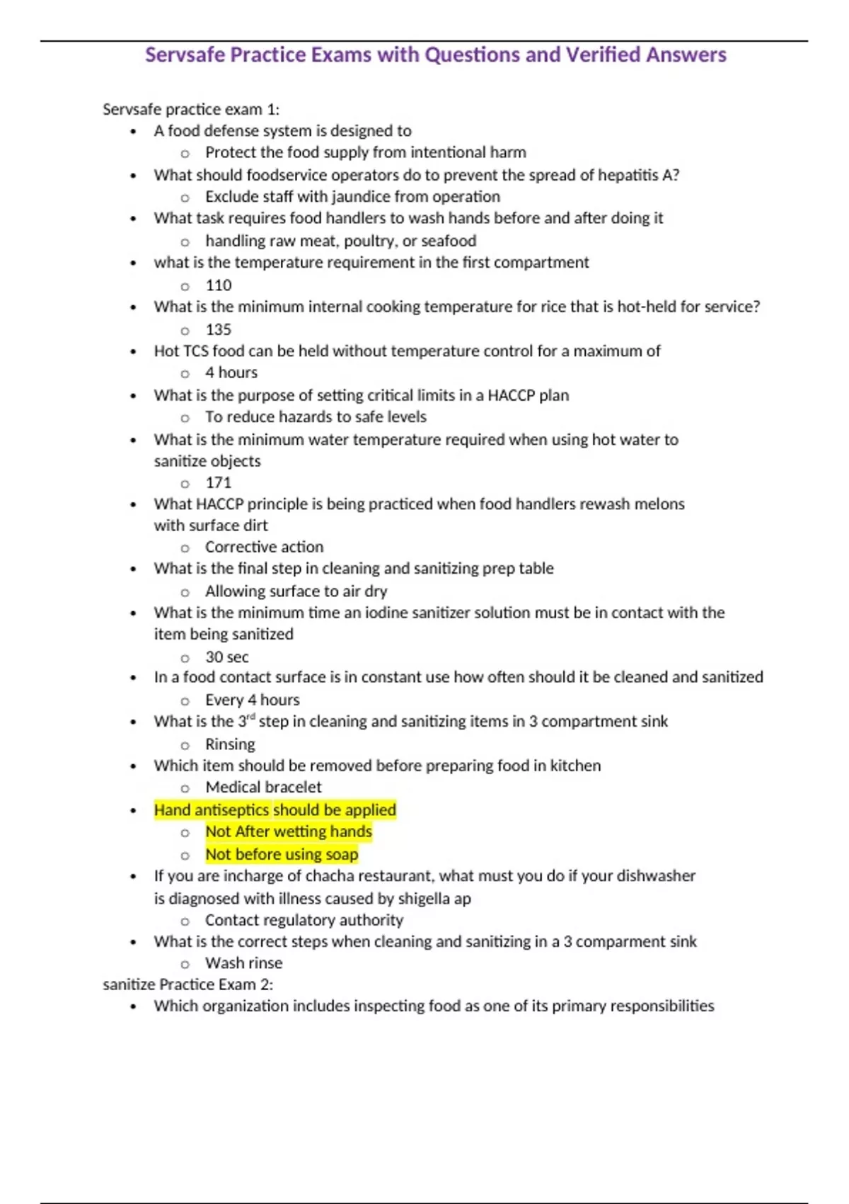 Servsafe Practice Exams with Questions and Verified Answers Servsafe practice exam 1: • A food defense system is designed to o Protect the food supply from intentional harm