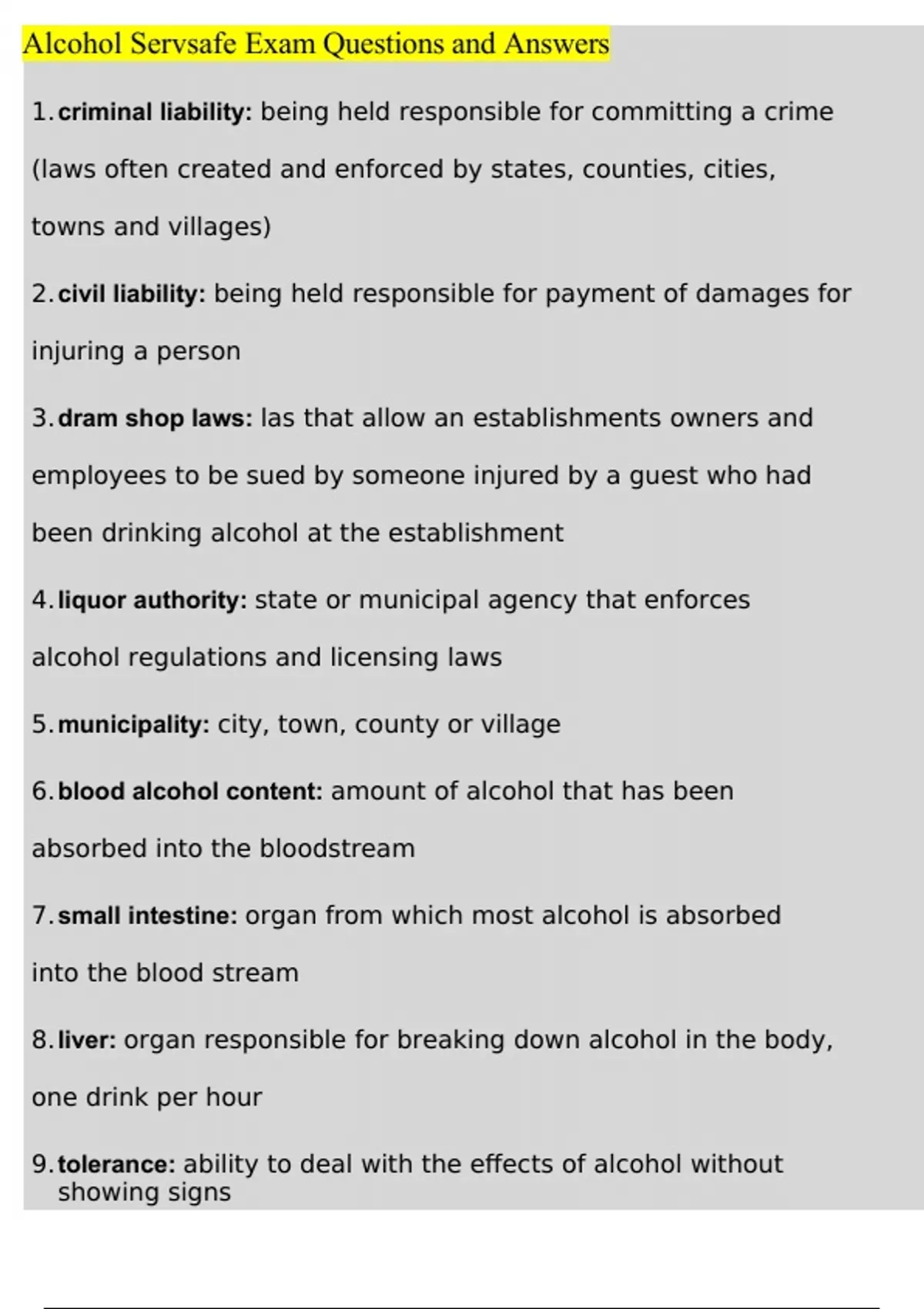 Alcohol Servsafe Exam Questions and Answers 1. criminal liability: being held responsible for committing a crime (laws often created and enforced by states, counties, cities, towns and villages)