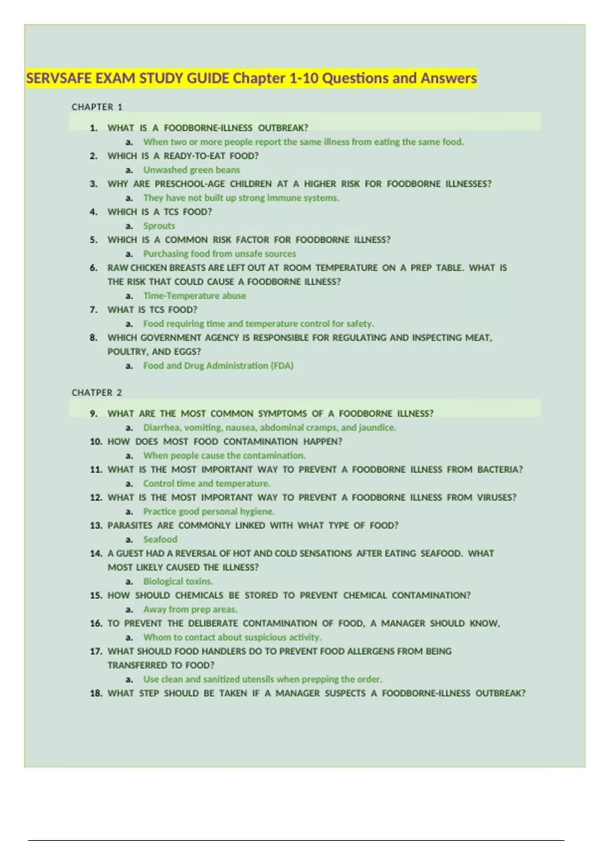SERVSAFE EXAM STUDY GUIDE Chapter 1-10 Questions and Answers 1. WHAT IS A FOODBORNE-ILLNESS OUTBREAK?