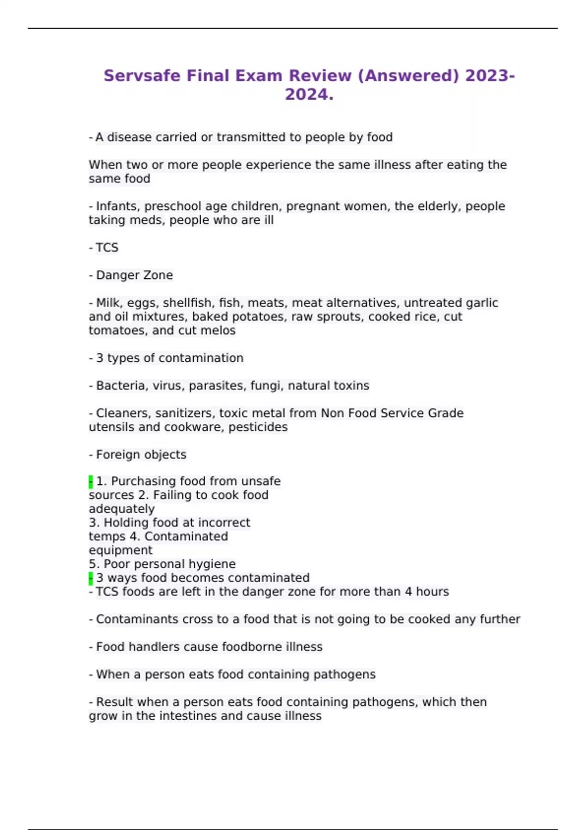 Servsafe Final Exam Review (Answered) . - A disease carried or transmitted to people by food When two or more people experience the same illness after eating the same food