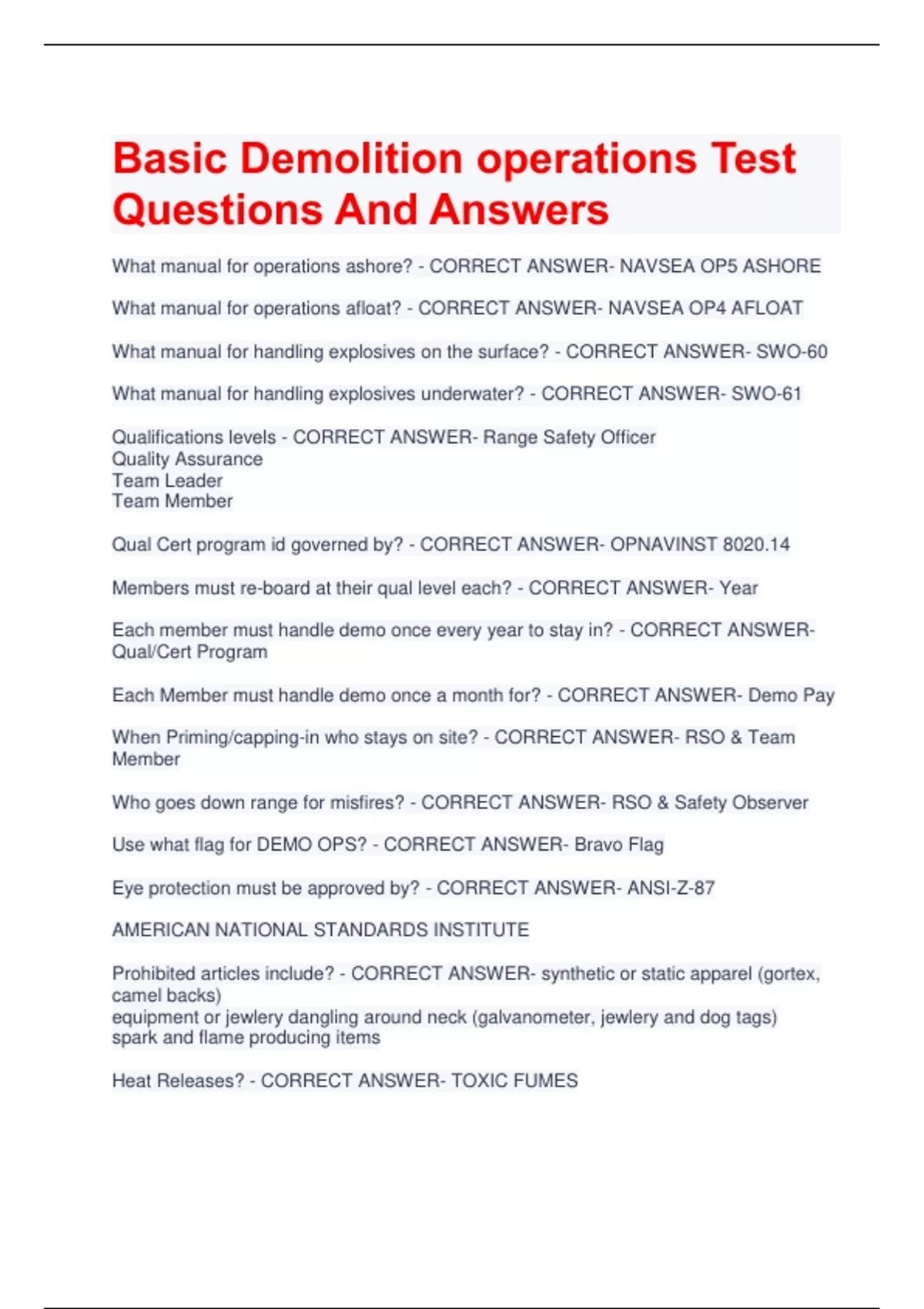 Basic Demolition operations Test Questions And Answers What manual for operations ashore? - CORRECT ANSWER- NAVSEA OP5 ASHORE What manual for operations afloat? - CORRECT ANSWER- NAVSEA OP4 AFLOAT What manual for handling explosives on the surface? - CORRECT ANSWER- SWO-60 What manual for handling explosives underwater? - CORRECT ANSWER- SWO-61 Qualifications levels - CORRECT ANSWER- Range Safety Officer Quality Assurance Team Leader Team Member Qual Cert program id governed by? - CORRECT ANSWER- OPNAVINST 8020.14 Members must re-board at their qual level each? - CORRECT ANSWER- Year Each member must handle demo once every year to stay in? - CORRECT ANSWERQual/Cert Program Each Member must handle demo once a month for? - CORRECT ANSWER- Demo Pay When Priming/capping-in who stays on site? - CORRECT ANSWER- RSO & Team Member Who goes down range for misfires? - CORRECT ANSWER- RSO & Safety Observer Use what flag for DEMO OPS? - CORRECT ANSWER- Bravo Flag Eye protection must be approved by? - CORRECT ANSWER- ANSI-Z-87 AMERICAN NATIONAL STANDARDS INSTITUTE Prohibited articles include? - CORRECT ANSWER- synthetic or static apparel (gortex, camel backs) equipment or jewlery dangling around neck (galvanometer, jewlery and dog tags) spark and flame producing items Heat Releases? - CORRECT ANSWER- TOXIC FUMES Explosive driver licence valid for? - CORRECT ANSWER- 2 Years Explosive Handler/driver phys. good for? - CORRECT ANSWER- 5 years Explosive driver must be how old on base and off base? - CORRECT ANSWER- 18-on Base 21-off Base CAT.1 & CAT.2 transportation requires? - CORRECT ANSWER- An Armed Guard see OPNAVINST 5530.13 NEVER STORE? - CORRECT ANSWER- Blasting caps and explosives together HERO - CORRECT ANSWER- Hazards of Electromagnetic Radiation to Ordnance Keep all communication equipment at least ________ away from HERO susceptible items? - CORRECT ANSWER- 25 ft Operations will stop during thunderstorms within? - CORRECT ANSWER- 5 Miles 25 seconds between sight and sound Cancel ops during.... - CORRECT ANSWER- electrical, sand, dust, or snow storms Demo crew shall remain at the area at least _____ after single shots and last shots in a series? - CORRECT ANSWER- 5 Minutes When fighting fires follow? - CORRECT ANSWER- Standard Operations of Procedures (SOP) Material Condition A-D - CORRECT ANSWER- Serviceable (authorized for use) Material Condition B-C-D - CORRECT ANSWER- Training (authorized for use) Material Condition E-H - CORRECT ANSWER- Unserviceable (not authorized for use) Material Condition J-N - CORRECT ANSWER- Suspended use (not authorized for use) Material Condition I - CORRECT ANSWER- Is not used Demolition is the use of explosives - CORRECT ANSWER- To clear harbors, inland waterways, channels, and offshore waters of sunken capsized or wrecked vessels or underwater obstacles Advantages of Demolition - CORRECT ANSWER- Channeling, ramping, trenching, flattening or removing obstacles Explosives undergo extremely rapid chemical and physical changes generating a large volume of? - CORRECT ANSWER- Large volume of GAS Intense HEAT High Pressure GHP What has a velocity greater then the speed of sound? - CORRECT ANSWER- High Explosives Has a velocity less then the speed of sound? - CORRECT ANSWER- Low Explosives low explosives changes from what to what? - CORRECT ANSWER- Solid to gaseous state slowly over sustained period Low explosives exerts? - CORRECT ANSWER- Rapid pushing effect rather then shattering effect Low explosives causes reactions referred to? - CORRECT ANSWER- Deflagration Brisance - CORRECT ANSWER- Shattering effect created by the shock wave of an explosive The value of TNT is - CORRECT ANSWER- 1.0