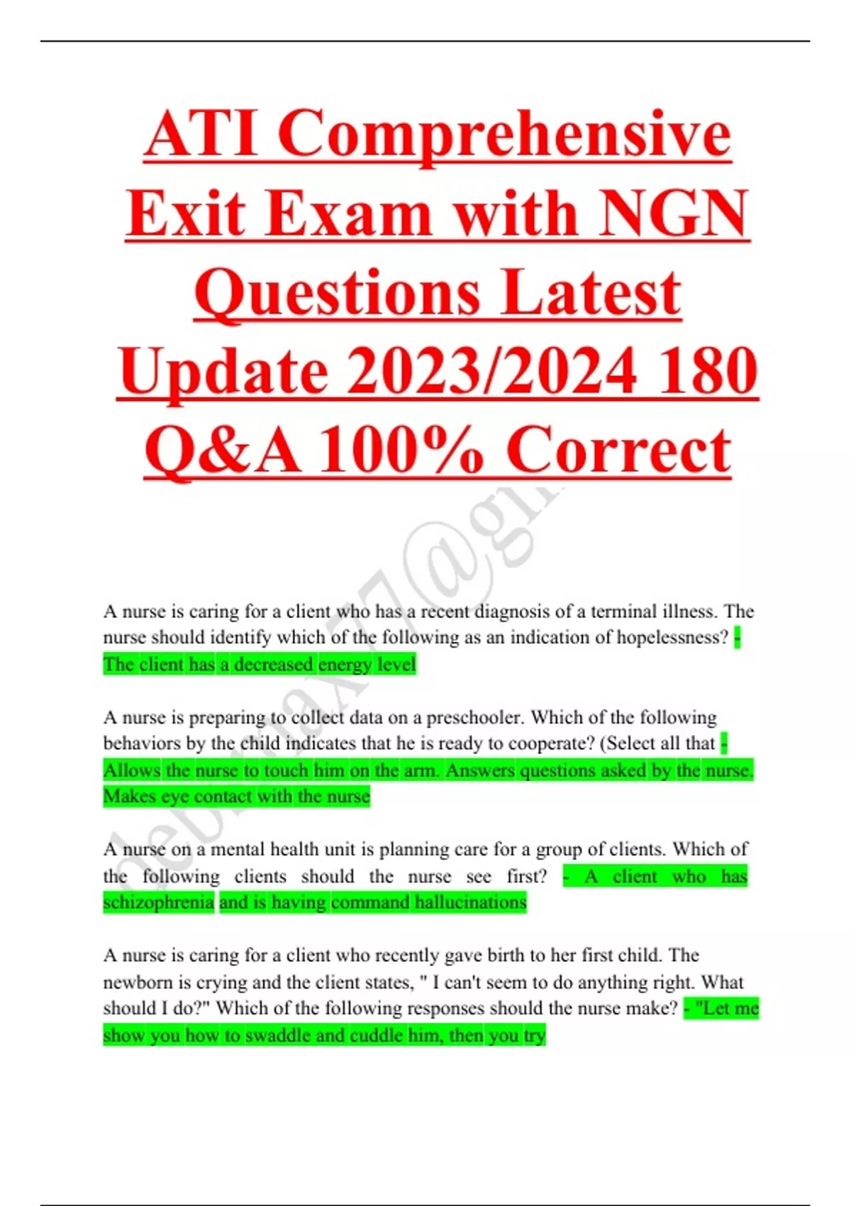 ATI Comprehensive Exit Exam with NGN Questions Latest Update 2023/2024 180 Q&A 100% Correct A nurse is caring for a client who has a recent diagnosis of a terminal illness. The nurse should identify which of the following as an indication of hopelessness? - Correct Answer -The client has a decreased energy level A nurse is preparing to collect data on a preschooler. Which of the following behaviors by the child indicates that he is ready to cooperate? (Select all that - Correct Answer -Allows the nurse to touch him on the arm. Answers questions asked by the nurse. Makes eye contact with the nurse A nurse on a mental health unit is planning care for a group of clients. Which of the following clients should the nurse see first? - Correct Answer -A client who has schizophrenia and is having command hallucinations A nurse is caring for a client who recently gave birth to her first child. The newborn is crying and the client states,