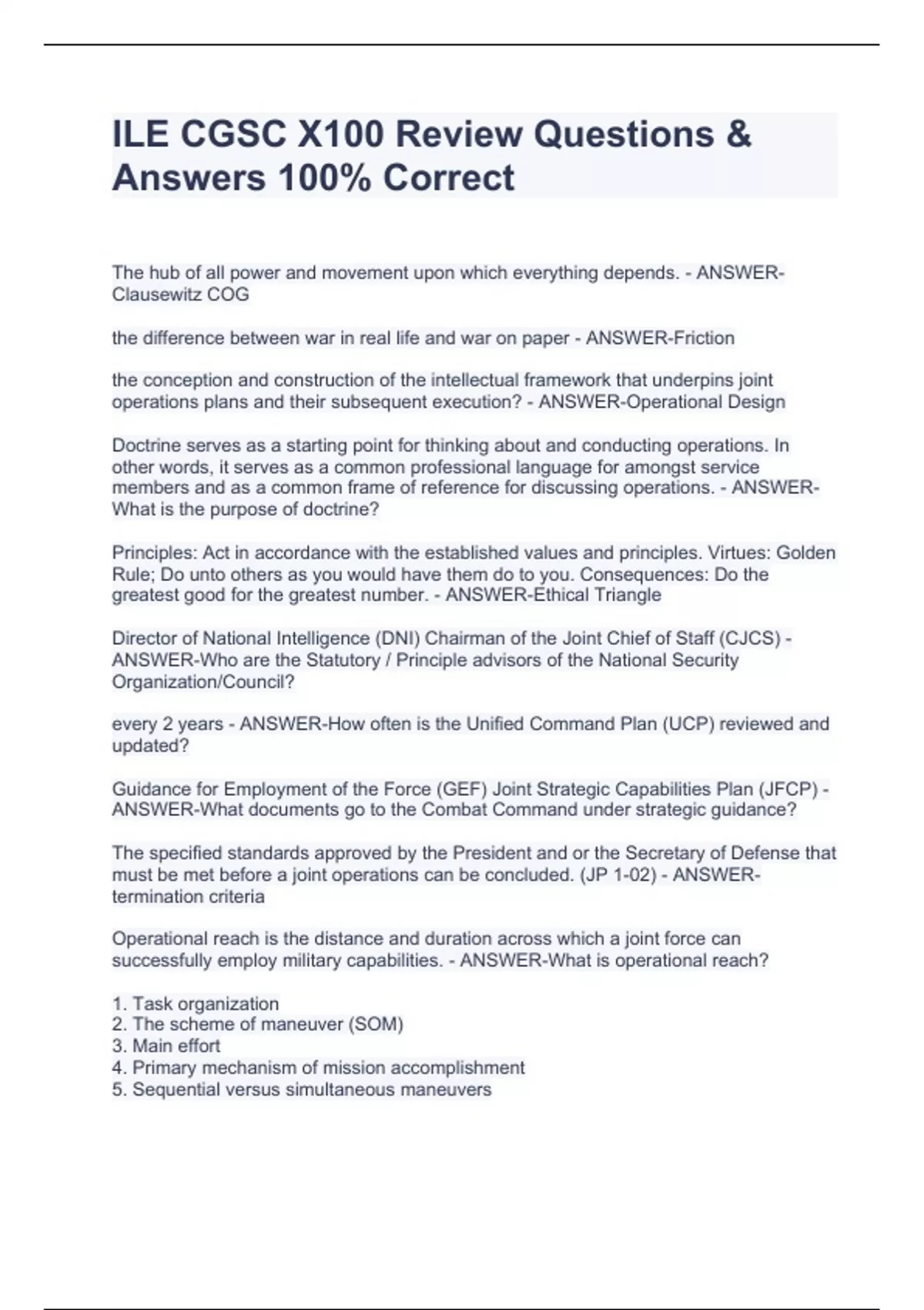 The hub of all power and movement upon which everything depends. - ANSWER-Clausewitz COG the difference between war in real life and war on paper - ANSWER-Friction the conception and construction of the intellectual framework that underpins joint operations plans and their subsequent execution? - ANSWER-Operational Design Doctrine serves as a starting point for thinking about and conducting operations. In other words, it serves as a common professional language for amongst service members and as a common frame of reference for discussing operations. - ANSWER-What is the purpose of doctrine? Principles: Act in accordance with the established values and principles. Virtues: Golden Rule; Do unto others as you would have them do to you. Consequences: Do the greatest good for the greatest number. - ANSWER-Ethical Triangle Director of National Intelligence (DNI) Chairman of the Joint Chief of Staff (CJCS) - ANSWER-Who are the Statutory / Principle advisors of the National Security Organization/Council? every 2 years - ANSWER-How often is the Unified Command Plan (UCP) reviewed and updated? ILE CGSC X100 Review Questions & Answers 100% Correct