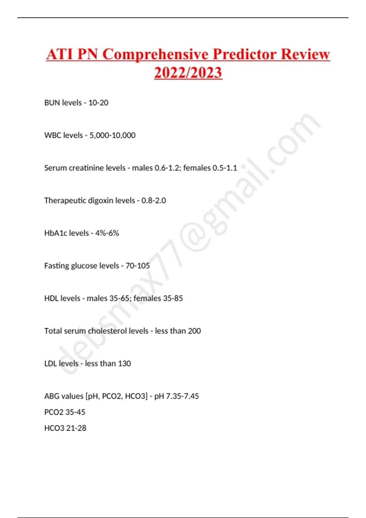 ATI PN Comprehensive Predictor Review 2022/2023 BUN levels - 10-20 WBC levels - 5,000-10,000 Serum creatinine levels - males 0.6-1.2; females 0.5-1.1 Therapeutic digoxin levels - 0.8-2.0 HbA1c levels - 4%-6% Fasting glucose levels - 70-105 HDL levels - males 35-65; females 35-85 Total serum cholesterol levels - less than 200 LDL levels - less than 130 ABG values [pH, PCO2, HCO3] - pH 7.35-7.45 PCO2 35-45 HCO3 21-28 Phosphorus levels - 3-4.5 Platelet levels - 150,000-400,000 a PTT levels; therapeutic level? - 30-40 seconds; therapeutic is 1.5 to 2 times the normal INR levels - 0.7-1.8 Therapeutic level for INR with anticoagulant therapy - 2-3 PT levels; therapeutic level? - 11-12.5 seconds; therapeutic is 1.5 to 2 times the normal Chloride levels - 98-106 Calcium levels - 9-10.5 Diseases that require airborne precautions - measles, TB, herpes zoster and varicella Heparin antidote - protamine sulfate Coumadin antidote - vitamin k Digoxin antidote - digibind Alcohol withdrawal antidote - librium (chlordiazepoxide) Potassium levels - 3.5-5 Sodium levels - 136-145 Magnesium sulfate antidote - calcium gluconate Magnesium levels - 1.3-2.1 Risk factors of metabolic alkalosis - ingestion of antacids; GI suction; hypokalemia; blood transfusion; prolonged vomiting; total parenteral nutrition A cause of metabolic acidosis - diarrhea [acidosis - from the ass]; fever; hypoxia; starvation; seizure; kidney failure; diabetic ketoacidosis; dehydration Hemoglobin levels - males 14-18; females 12-16 Hematocrit levels - males 42%-52%; females 37%-47% ESR levels - less than 20 Glucose levels [urinalysis] - less than 0.5g/day Specific gravity [urinalysis] - 1.005-1.025 Therapeutic lithium levels - 0.4-1.4