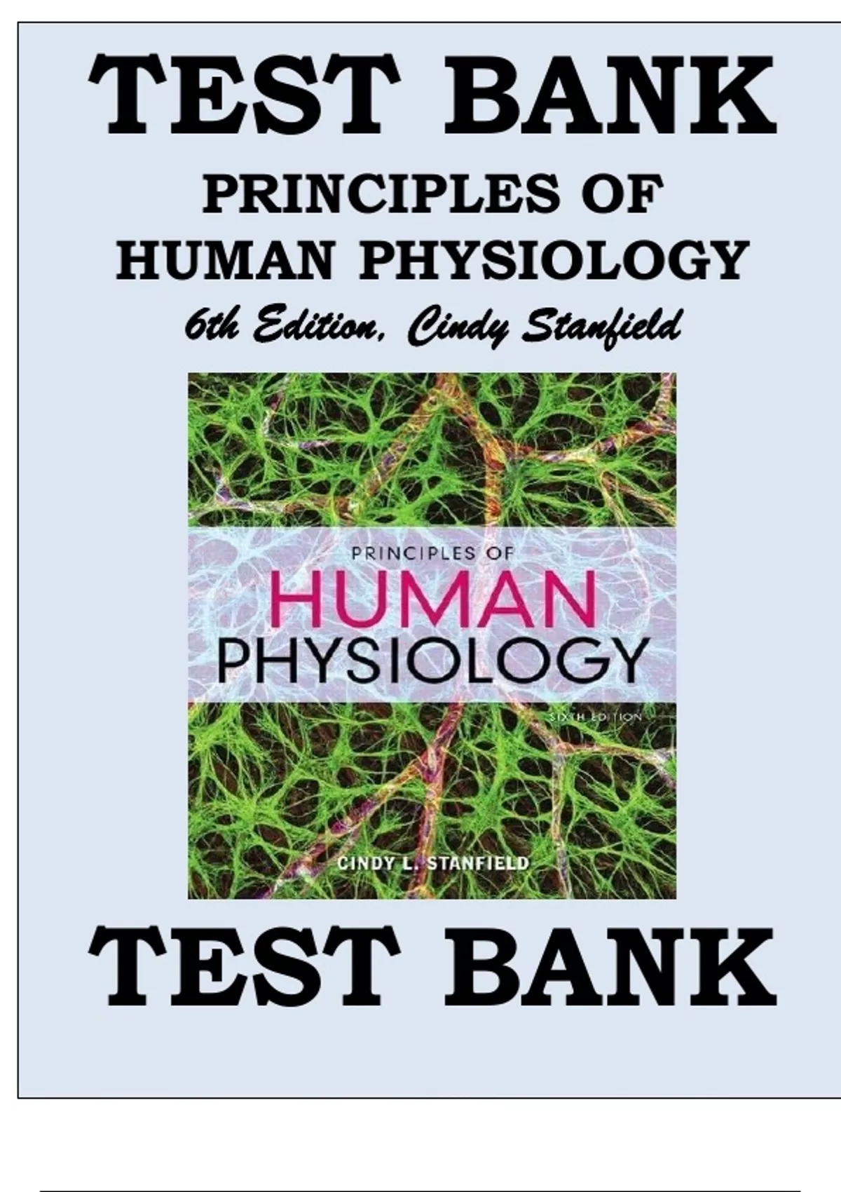 TEST BANK PRINCIPLES OF HUMAN PHYSIOLOGY 6th Edition, Cindy Stanfield | All Chapters Contents Introduction to Physiology The Cell: Structure and Function Cell Metabolism Cell Membrane Transport Chemical Messengers The Endocrine System: Endocrine Glands and Hormone Actions Nerve Cells and Electrical Signaling Synaptic Transmission and Neural Integration The Nervous System: Central Nervous System The Nervous System: Sensory Systems The Nervous System: Autonomic and Motor Systems Muscle Physiology The Cardiovascular System: Cardiac Function The Cardiovascular System: Blood Vessels, Blood Flow, and Blood Pressure The Cardiovascular System: Blood The Respiratory System: Pulmonary Ventilation The Respiratory System: Gas Exchange and the Regulation of Breathing The Urinary System: Renal Function The Urinary System: Fluid and Electrolyte Balance The Gastrointestinal System The Endocrine System. Regulation of Energy Metabolism and Growth The Reproductive System The Immune System Diabetes Mellitus