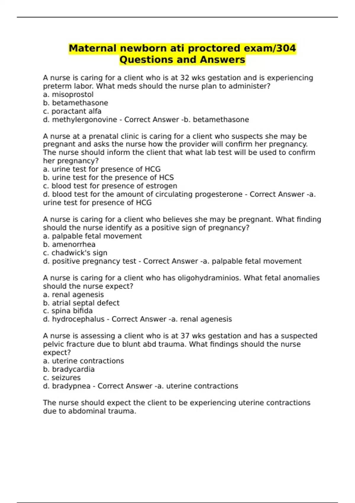 Maternal newborn ati proctored exam/304 Questions and Answers A nurse is caring for a client who is at 32 wks gestation and is experiencing preterm labor. What meds should the nurse plan to administer? a. misoprostol b. betamethasone c. poractant alfa d. methylergonovine - Correct Answer -b. betamethasone A nurse at a prenatal clinic is caring for a client who suspects she may be pregnant and asks the nurse how the provider will confirm her pregnancy. The nurse should inform the client that what lab test will be used to confirm her pregnancy? a. urine test for presence of HCG b. urine test for the presence of HCS c. blood test for presence of estrogen d. blood test for the amount of circulating progesterone - Correct Answer -a. urine test for presence of HCG A nurse is caring for a client who believes she may be pregnant. What finding should the nurse identify as a positive sign of pregnancy? a. palpable fetal movement b. amenorrhea c. chadwick's sign d. positive pregnancy test - Correct Answer -a. palpable fetal movement A nurse is caring for a client who has oligohydraminios. What fetal anomalies should the nurse expect? a. renal agenesis b. atrial septal defect c. spina bifida d. hydrocephalus - Correct Answer -a. renal agenesis A nurse is assessing a client who is at 37 wks gestation and has a suspected pelvic fracture due to blunt abd trauma. What findings should the nurse expect? a. uterine contractions b. bradycardia c. seizures d. bradypnea - Correct Answer -a. uterine contractions The nurse should expect the client to be experiencing uterine contractions due to abdominal trauma. A nurse is assessing a client who is at 12 wks gestation and has hydatidiform mole. What findings should the nurse expect? a. hypothermia b. dark brown vaginal discharge c. fetal heart tones d. decreased urinary output - Correct Answer -b. dark brown vaginal discharge A hydatidiform mole, or a molar pregnancy, is a benign proliferative growth of the chorionic villi, which gives rise to multiple cysts. The products of conception transform into a large number of edematous, fluid-filled vesicles. As cells slough off the uterine wall, vaginal discharge is usually dark brown and can contain grapelike clusters. A nurse is assessing a client who is at 35 weeks of gestation and has mild gestational HTN. What finding should the nurse identify as the priority? a. 480 mL urine output in 24 hrs b. 1+ protein in the urine c. +2 edema of the feet d. BP 144/92 - Correct Answer -a. 480 mL urine output in 24 hrs When using the urgent vs. nonurgent approach to client care, the nurse should determine that the priority finding is 480 mL of urine output in 24 hr because the minimum acceptable urine output in an adult client is 30 mL/hr. This can indicate progression of preeclampsia to preeclampsia with severe features, which requires immediate intervention. Therefore, this is the priority finding. A nurse is teaching a client who is at 12 wks gestation and has HIV. What statement should the nurse include in the teaching? a. you will be in isolation after delivery b. abstain from sexual intercourse throughout pregnancy c. breastfeed your newborn to provide passive immunity d. you should continue to take zidovudine throughout the pregnancy - Correct Answer -d. you should continue to take zidovudine throughout the pregnancy -can be transmitted through breastfeeding -she can continue to have sex The nurse should inform the client that taking prescription antiviral medication every day decreases the risk of transmission of HIV to her newborn. A nurse is providing teaching to a client who is at 8 wks gestation about manifestations to report to the provider during pregnancy. What info should the nurse include in the teaching? a. nausea upon awakening b. blurred or double vision c. increase in white vaginal discharge d. leg cramps when sleeping - Correct Answer -b. blurred or double vision A nurse is caring for a client who is in the latent phase of labor and is receiving oxytocin via continuous IV infusion. The nurse notes that the client is having contractions every 2 min which last 100-110 seconds that the fetal heart rate is reassuring. What action should the nurse take? a. decrease the dose of oxytocin by half b. administer oxygen via nonrebreather mask c. decrease the infusion rate of the maintenance IV fluid d. administer terbutaline 0.25mg subq - Correct Answer -a. decrease the dose of oxytocin by half The nurse should decrease the dose of oxytocin by half because the client is experiencing uterine tachysystole. A nurse is caring for a client who is in active labor and has meconium staining of the amniotic fluid. The nurse notes a reassuring FHR tracing from the external fetal monitor. What action should the nurse take? a. prepare the client for emergency c-section b. perform endotrach suctioning as soon as the fetal head is delivered c. prepare equipment needed for newborn resuscitation d. prepare the client for an ultrasound exam - Correct Answer -c. prepare equipment needed for newborn resuscitation The nurse should ensure that all supplies and equipment needed for resuscitation of the newborn are readily available for every delivery. Endotracheal suctioning is recommended in cases of meconium staining only if the newborn has poor respiratory effort, decreased muscle tone, and bradycardia after delivery. A nurse is reviewing the medical record of a client who is at 33 wks gestation and has placenta previa and bleeding. What scripts should the nurse clarify with the provider? a. insert a large-bore IV catheter b. perform a vaginal exam c. perform continuous external fetal monitoring d. obtain a blood sample for lab testing - Correct Answer -b. perform a vaginal exam When a client has a placenta previa, the placenta implants in the lower part of the uterus and obstructs the cervical os (the opening to the vagina). The nurse should clarify this prescription because any manipulation can cause tearing of the placenta and incre