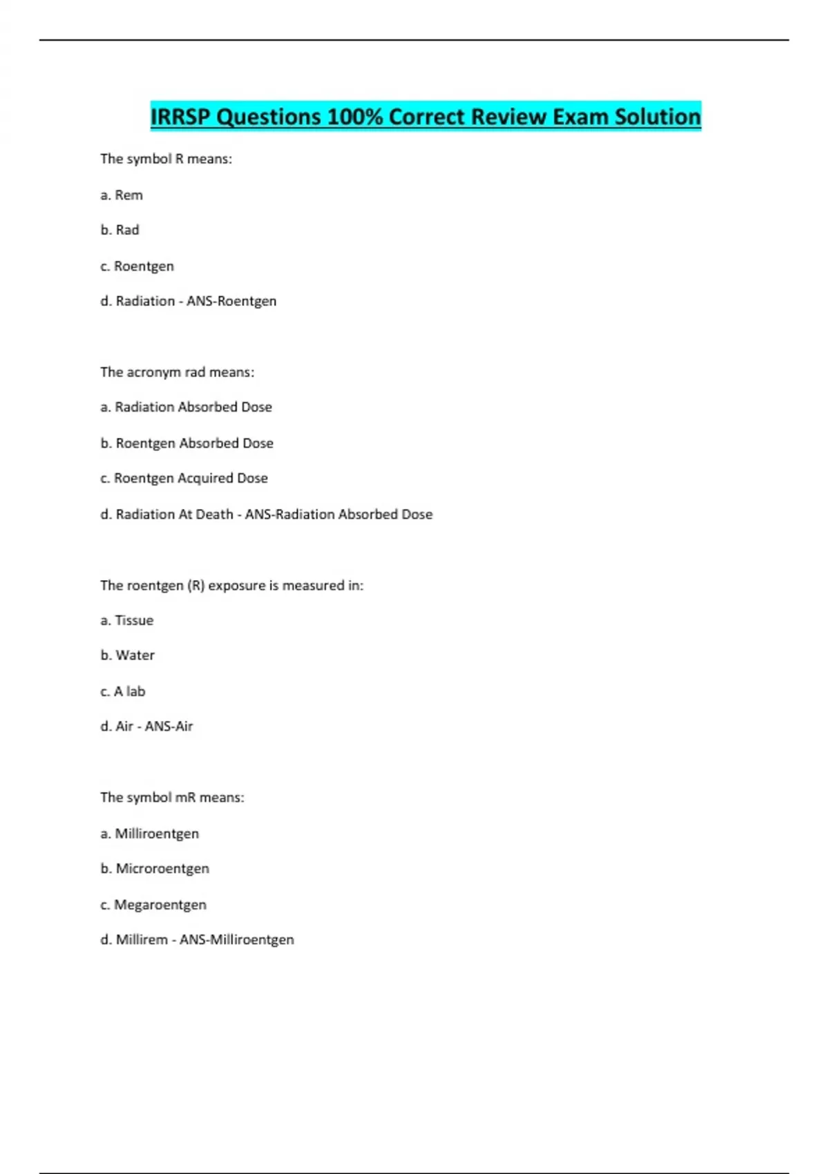 IRRSP Questions 100% Correct Review Exam Solution The symbol R means: a. Rem b. Rad c. Roentgen d. Radiation - ANS-Roentgen The acronym rad means: a. Radiation Absorbed Dose b. Roentgen Absorbed Dose c. Roentgen Acquired Dose d. Radiation At Death - ANS-Radiation Absorbed Dose The roentgen (R) exposure is measured in: a. Tissue b. Water c. A lab d. Air - ANS-Air The symbol mR means: a. Milliroentgen b. Microroentgen c. Megaroentgen d. Millirem - ANS-Milliroentgen One roentgen or 1 R is equal to: a. 100 mR b. 1000 mR c. 0.001 mR d. 1 mR - ANS-1000 mR The acronym rem stands for: a. Radiation Equivalent Man b. Radiation Effect Man c. Roentgen Effect Man d. Roentgen Equivalent Man - ANS-Roentgen Equivalent Man The initialism QF stands for: a. Quantity factor b. Quality frequency c. Quality factor d. Quality effective factor - ANS-Quality factor The quality factor for X-rays and gamma rays is: