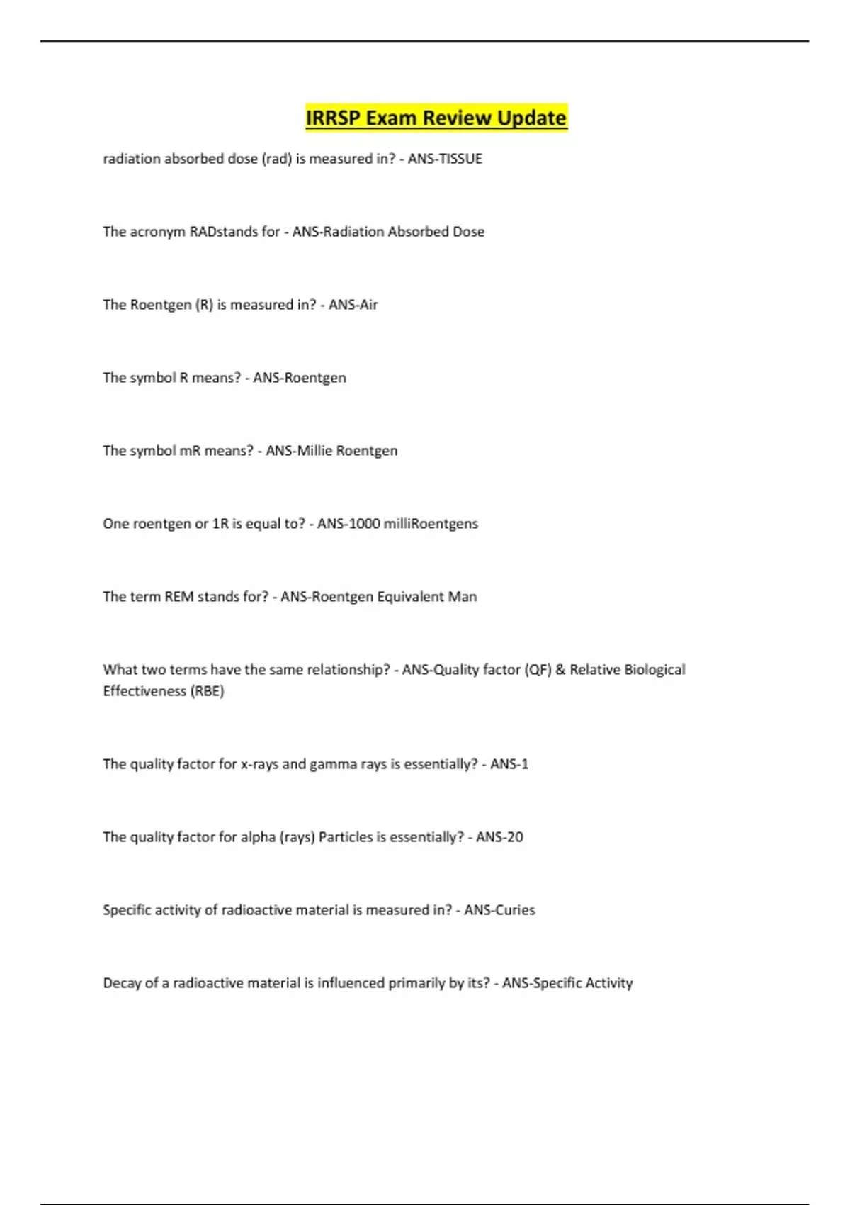 IRRSP Exam Review Update radiation absorbed dose (rad) is measured in? - ANS-TISSUE The acronym RADstands for - ANS-Radiation Absorbed Dose The Roentgen (R) is measured in? - ANS-Air The symbol R means? - ANS-Roentgen The symbol mR means? - ANS-Millie Roentgen One roentgen or 1R is equal to? - ANS-1000 milliRoentgens The term REM stands for? - ANS-Roentgen Equivalent Man What two terms have the same relationship? - ANS-Quality factor (QF) & Relative Biological Effectiveness (RBE) The quality factor for x-rays and gamma rays is essentially? - ANS-1 The quality factor for alpha (rays) Particles is essentially? - ANS-20 Specific activity of radioactive material is measured in? - ANS-Curies Decay of a radioactive material is influenced primarily by its? - ANS-Specific Activity Becquerel and curies are units of measurement of? - ANS-Decay rate Becquerel and curies are units of measurement of? - ANS-Specific Activity A state which atoms have excess energy and are unstable is known as? - ANS-Radioactive An elementary particles with a unit negative electrical charge and a mass approximately equal to 1/184th that of a proton. - ANS-Electrons A positively charged elementary particle with a mass approximately equal to 1840 times that of an electron is know as? - ANS-Protons An uncharged elementary particle with a mass nearly equal to that of a proton. A neutron is stable when bond in an atomic nucleus and has a mass approximately equal to 1840 times that of an election. - ANSNeutrons The area known as the center of an atom is called? - ANS-