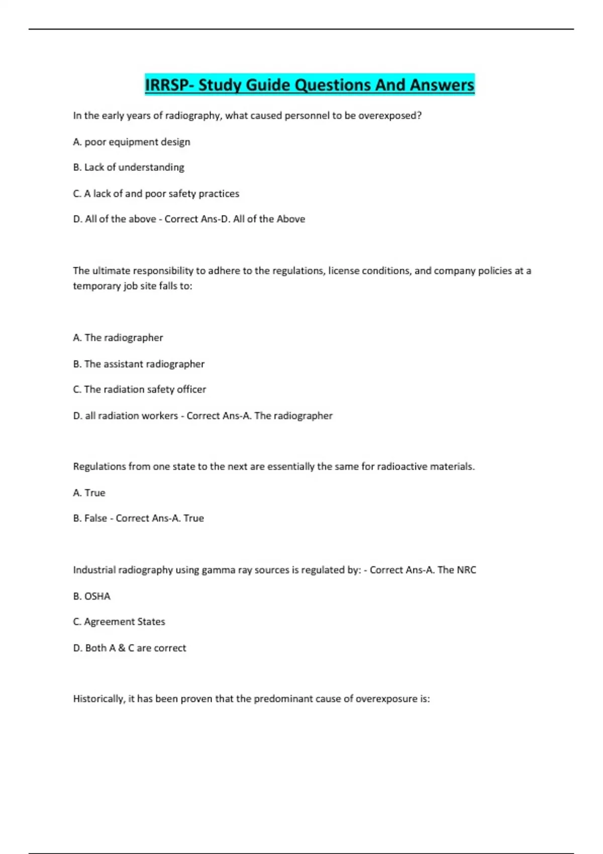 IRRSP- Study Guide Questions And Answers In the early years of radiography, what caused personnel to be overexposed? A. poor equipment design B. Lack of understanding C. A lack of and poor safety practices D. All of the above - Correct Ans-D. All of the Above The ultimate responsibility to adhere to the regulations, license conditions, and company policies at a temporary job site falls to: A. The radiographer B. The assistant radiographer C. The radiation safety officer D. all radiation workers - Correct Ans-A. The radiographer Regulations from one state to the next are essentially the same for radioactive materials. A. True B. False - Correct Ans-A. True Industrial radiography using gamma ray sources is regulated by: - Correct Ans-A. The NRC B. OSHA C. Agreement States D. Both A & C are correct Historically, it has been proven that the predominant cause of overexposure is: A. Improper surveys B. The source being left in an uncontrolled state C. The source not being locked once retracted to the shielded position. D. All of the Above - Correct Ans-D. All of the Above Who is the first person the radiographer should seek guidance from in the event of an emergency? A. The NRC B. A senior technician C. Their state or a federal jurisdiction hotline D. Their company RSO - Correct Ans-D. Their Company RSO Any Individual who uses radiographic exposure devices, sealed sources, related handling tools, or survey instruments while under the supervision of a radiographer is a (n): A. Student B. Member of the public C. Assistant Radiographer D. Radiographer - Correct Ans-C. Assistant Radiographer Who first discovered X-rays? A. Marie Curie B. Albert Einstein C. Wilhelm Roentgen D. Thomas Edison - Correct Ans-C. Wilhelm Roentgen Electromagnetic radiation travels: A. In a motion which allows it to curve around objects. CONTINUES...