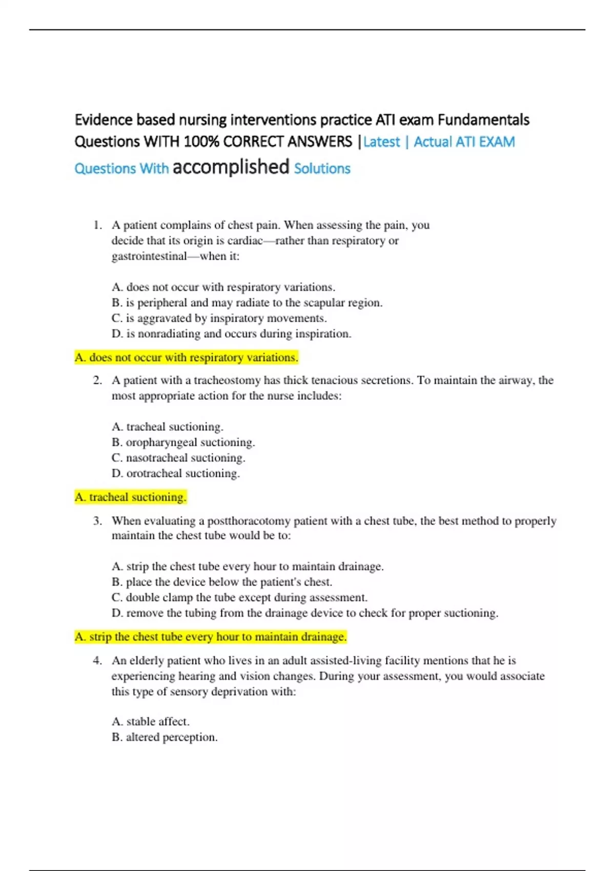 Evidence based nursing interventions practice ATI exam Fundamentals Questions WITH 100% CORRECT ANSWERS |Latest | Actual ATI EXAM Questions With accomplished Solutions