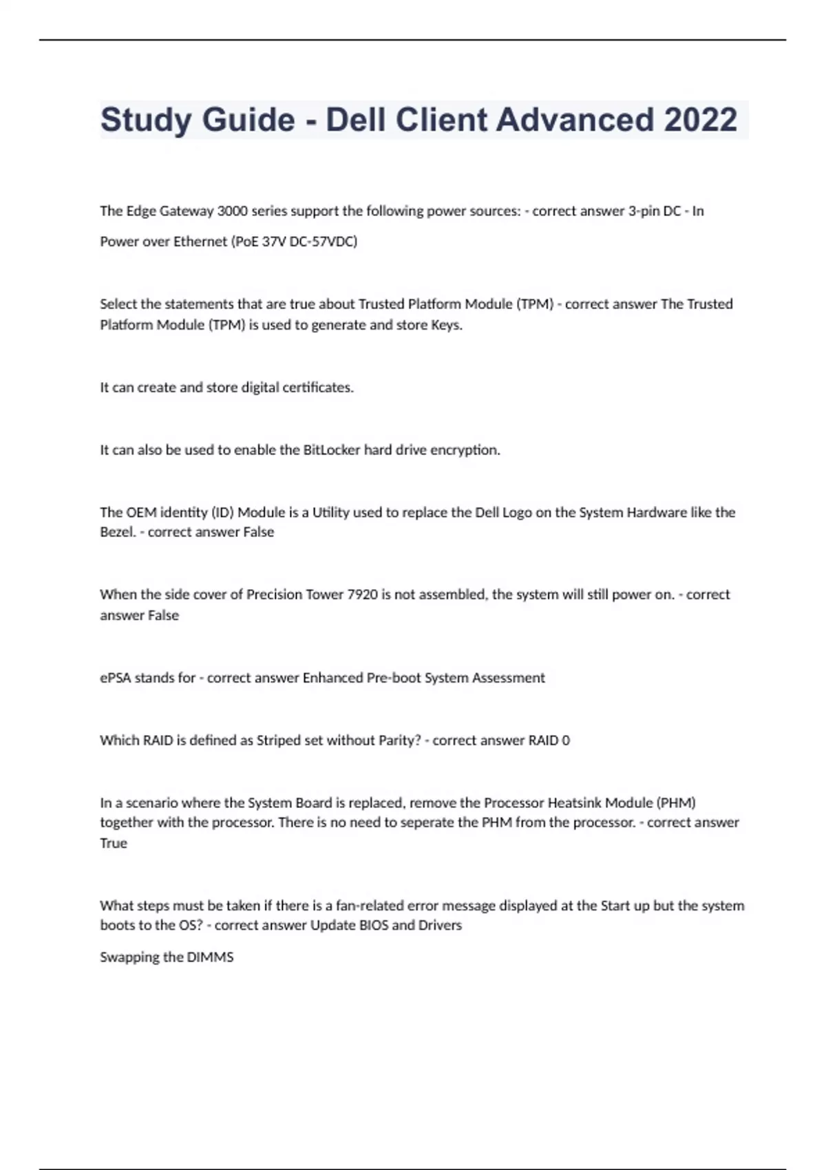 Study Guide - Dell Client Advanced 2022The Edge Gateway 3000 series support the following power sources: - correct answer 3-pin DC - In Power over Ethernet (PoE 37V DC-57VDC) Select the statements that are true about Trusted Platform Module (TPM) - correct answer The Trusted Platform Module (TPM) is used to generate and store Keys. It can create and store digital certificates. It can also be used to enable the BitLocker hard drive encryption. The OEM identity (ID) Module is a Utility used to replace the Dell Logo on the System Hardware like the Bezel. - correct answer False When the side cover of Precision Tower 7920 is not assembled, the system will still power on. - correct answer False ePSA stands for - correct answer Enhanced Pre-boot System Assessment Which RAID is defined as Striped set without Parity? - correct answer RAID 0 In a scenario where the System Board is replaced, remove the Processor Heatsink Module (PHM) together with the processor. There is no need to seperate the PHM from the processor. - correct answer True What steps must be taken if there is a fan-related error message displayed at the Start up but the system boots to the OS? - correct answer Update BIOS and Drivers Swapping the DIMMS The Dell Precision System board is shipped in Manufacturing mode and the User or Service Provider must select the manageability option upon first boot after replacement. - correct answer True We Import a Foreign configuration in a RAID Array, if: - correct answer The array containing the foreign configuration is in an Offline state. Which indicator shows whether power is present or power fault has occurred in Precision systems? - correct answer Both Where can the field Service Manual containing Critical Callout, Disassembly and Reassembly instructions be found? - correct answer PRM/ Educate Dell The touchscreen LCD assembly for Alienware 13R3 is a Hinge-Up Design (HUD) assembly and cannot be further disassembled once it is removed from the chassis - correct answer True iDRAC with Lifecycle Controller can be used for - correct answer .... In the latest Precision Rack, the iDRAC Enterprise license is available by default - correct answer False USB Service Key is used for Windows OS Installation and debranding (for OEM) in an Edge Gateway - correct answer True Select all the LED codes for Memory related issues in a Dell Edge Gateway - correct answer 2,3 2,4 2,5 On a Precision Workstation, if a Hard drive status indicator flashes green, amber and then turns off; this indicates the drive is rebuilding - correct answer False A CAN (Controller Area Network) bus is a vehicle bus standard designed to allow micro controllers and devices to communicate with each other in applications without a host computer. - correct answer True In a PERC H730P controller, P stands for Performance - correct answer True DPK stands for - correct answer Digital Product Key After completing a service incident on a Precision Tower 7920, technician attempts to run ePSA before re-assembling the side cover. However, system is not able to power on and displays LED error code of 4-7. What could be the issue? - correct answer The intrusion switch is triggered and power is cut-off. Install the side cover to de-activate the intrusion switch.
