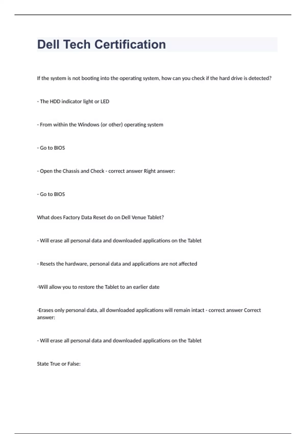 Dell Tech CertificationIf the system is not booting into the operating system, how can you check if the hard drive is detected? - The HDD indicator light or LED - From within the Windows (or other) operating system - Go to BIOS - Open the Chassis and Check - correct answer Right answer: - Go to BIOS What does Factory Data Reset do on Dell Venue Tablet? - Will erase all personal data and downloaded applications on the Tablet - Resets the hardware, personal data and applications are not affected -Will allow you to restore the Tablet to an earlier date -Erases only personal data, all downloaded applications will remain intact - correct answer Correct answer: - Will erase all personal data and downloaded applications on the Tablet State True or False: Discrete Graphics cards connect to the motherboard of a computer system using a slot, typically an Accelerated Graphics Port (AGP) or a Peripheral Component Interconnect Express (PCIe) - correct answer Statement is: - True Why sometimes the values in BIOS cannot be saved and shows as manufacturing mode? - The systemboard jumper is at CMOS_CLR state - The systemboard jumper is at SERVICE_MODE state - The systemboard is faulty - THe systemboard jumper is at PASSWORD-CLR state - correct answer Correct Answer: - The systemboard jumper is at SERVICE_MODE state Choose all that Apply: Which of the following statements are true about the New PSU BIST? - During PSU BIST, If PSU LED light will stay ON - PSU is functioning properly - To restart the PSU BIST : Disconnect the AC power cord for 15 seconds (PSU BIST reset time), and then plug in the AC power cord - To start the PSU BIST: Plug in the AC power cord & note the LED light status - Ensure to disconnect the AC power cord from the PSU, before starting the PSU BIST - correct answer