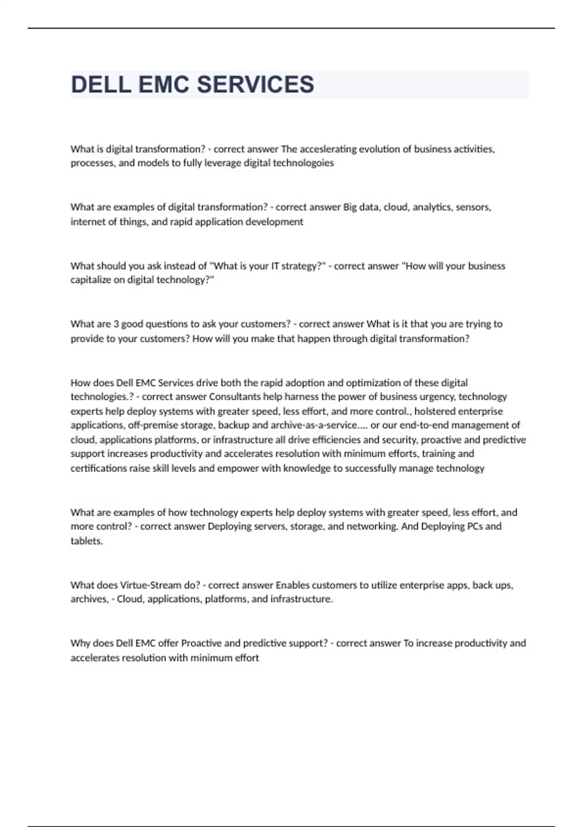 DELL EMC SERVICESDELL EMC SERVICESWhat is digital transformation? - correct answer The acceslerating evolution of business activities, processes, and models to fully leverage digital technologoies What are examples of digital transformation? - correct answer Big data, cloud, analytics, sensors, internet of things, and rapid application development What should you ask instead of "What is your IT strategy?" - correct answer "How will your business capitalize on digital technology?" What are 3 good questions to ask your customers? - correct answer What is it that you are trying to provide to your customers? How will you make that happen through digital transformation? How does Dell EMC Services drive both the rapid adoption and optimization of these digital technologies.? - correct answer Consultants help harness the power of business urgency, technology experts help deploy systems with greater speed, less effort, and more control., holstered enterprise applications, off-premise storage, backup and archive-as-a-service.... or our end-to-end management of cloud, applications platforms, or infrastructure all drive efficiencies and security, proactive and predictive support increases productivity and accelerates resolution with minimum efforts, training and certifications raise skill levels and empower with knowledge to successfully manage technology What are examples of how technology experts help deploy systems with greater speed, less effort, and more control? - correct answer Deploying servers, storage, and networking. And Deploying PCs and tablets. What does Virtue-Stream do? - correct answer Enables customers to utilize enterprise apps, back ups, archives, - Cloud, applications, platforms, and infrastructure. Why does Dell EMC offer Proactive and predictive support? - correct answer To increase productivity and accelerates resolution with minimum effort What is the purpose of training and certifications? - correct answer To raise skill levels and empower with knowledge to successfully manage technology What are Dell Pc's tablets, servers, storage, and networking comprised of? - correct answer ProSupport Client Suite, ProSupport Enterprise Suite, ProDeployClient Suite, ProDeploy Enterprise Suite What is EMC Storage comprised of? - correct answer Basic support, enhanced support, premium support, personalized support, planning and design, installation and implementation, integration, data & process migration, operation & optimization How much is the rates of customer Satisfaction of Dell and EMC? How well do the two work together? - correct answer Dell is 94% and EMC is 93%. They work better together and are the award winning WORLD-CLASS customer experience. How many Dell EMC services & Partner professionals are there? - correct answer 60,000+ How many DELL EMC Certifications are there? - correct answer 120,000+ How many countries are Dell EMC Services involves and working for? - correct answer 165+ Call To Action - Discover 1 - correct answer What is it that your customer is trying to provide their students, their customers, their clients, though digital technologies? Call To Action - Learn 2 - correct answer Learn how Dell EMC Services drive both the rapid adoption and the optimization of these digital technologies. Call To Action - Engage 3 - correct answer Engage in a Dell EMC Services Executive or Representative for details regarding our services offerings for your customers. What is the best type of question to help you understand your customers needs ? - correct answer "What is it you are trying to provide your customers?"