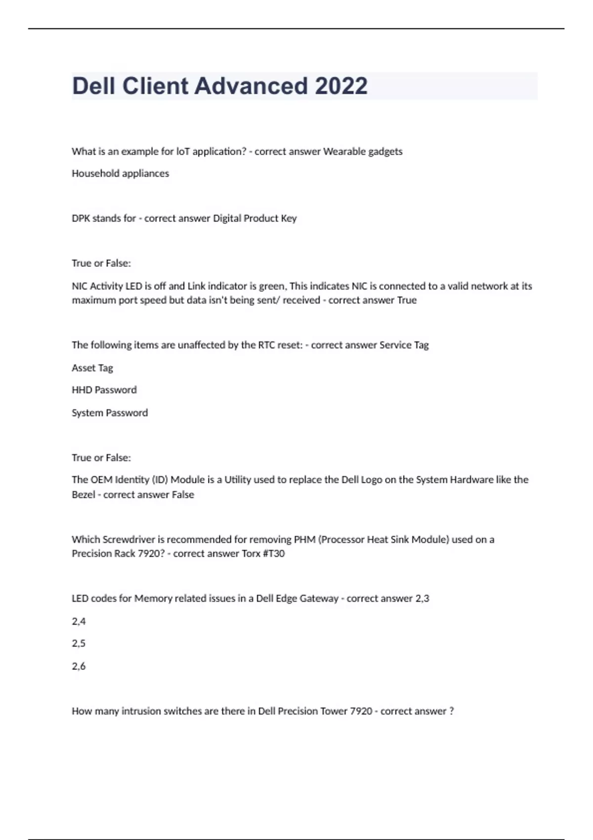 Dell Client Advanced 2022What is an example for loT application? - correct answer Wearable gadgets Household appliances DPK stands for - correct answer Digital Product Key True or False: NIC Activity LED is off and Link indicator is green, This indicates NIC is connected to a valid network at its maximum port speed but data isn't being sent/ received - correct answer True The following items are unaffected by the RTC reset: - correct answer Service Tag Asset Tag HHD Password System Password True or False: The OEM Identity (ID) Module is a Utility used to replace the Dell Logo on the System Hardware like the Bezel - correct answer False Which Screwdriver is recommended for removing PHM (Processor Heat Sink Module) used on a Precision Rack 7920? - correct answer Torx #T30 LED codes for Memory related issues in a Dell Edge Gateway - correct answer 2,3 2,4 2,5 2,6 How many intrusion switches are there in Dell Precision Tower 7920 - correct answer ? True or False: In Alienware systems, errors are indicated via the tricolor Power Button LED - correct answer False In general, am Anit-Static Mat is used to prevent Electrostatic Damage - correct answer True Which indicator shows whether Power is present or a power fault has occurred in Precision systems? - correct answer ? ePSA stands for - correct answer Enhanced Pre-boot System Assessment If an Edge Gateway is Blinking Green after the diagnostics, What does it indicated? - correct answer ? In a Precision Rack, one PSU is faulty and other one is fine. After hot plugging the new PSU it starts to blink green and turns off. What do you think is the cause - correct answer PSU has Firmware/Voltage mismatch True or False: On a Precision Workstation, if a Hard drive status indicator flashes green, amber and then turns off; this indicates the drive is rebuilding - correct answer False iDRAC stands for: - correct answer Integrated Dell Remote Access Controller True or False: In the latest Precision Rack, the iDRAC Enterprise License is available by default - correct answer False Statements which are right concerning RAID 5 - correct answer It strips the Data among the drives with a parity bit It can sustain up to one drive failure Minimum number of drives is 3