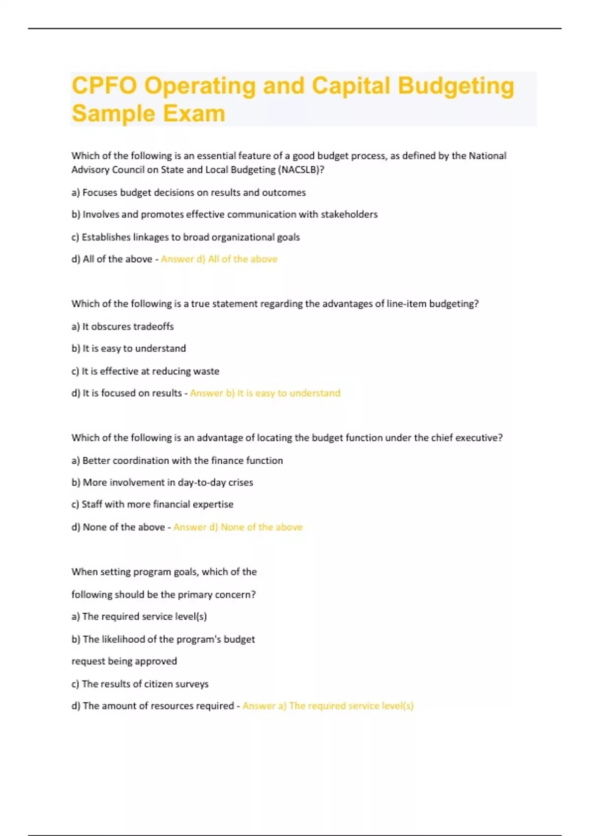 Which of the following is an essential feature of a good budget process, as defined by the National Advisory Council on State and Local Budgeting (NACSLB)? a) Focuses budget decisions on results and outcomes b) Involves and promotes effective communication with stakeholders c) Establishes linkages to broad organizational goals d) All of the above - Answer d) All of the above Which of the following is a true statement regarding the advantages of line-item budgeting? a) It obscures tradeoffs b) It is easy to understand c) It is effective at reducing waste d) It is focused on results - Answer b) It is easy to understand Which of the following is an advantage of locating the budget function under the chief executive? a) Better coordination with the finance function b) More involvement in day-to-day crises c) Staff with more financial expertise d) None of the above - Answer d) None of the above When setting program goals, which of the following should be the primary concern? a) The required service level(s) b) The likelihood of the program's budget request being approved c) The results of citizen surveys d) The amount of resources required - Answer a) The required service level(s)A well-conceived and executed budget classification structure: a) incorporates direct reference to the chart of accounts b) should be succinct and limited to fund, organizational unit, and activity, c) must include information regarding the programmatic nature of the proposed spending d) provides information in a format and at a level of detail to facilitate budget analysis and decision making - Answer A well-conceived and executed budget classification structure: d) provides information in a format and at a level of detail to facilitate budget analysis and decision making The National Advisory Council on State and Local Government Budgeting identified a principal entitled, "Develop a Budget Consistent with Approaches to Achieve Goals." Which of the following was not called for in establishing linkage? a) Conduct long-range planning b) Evaluate the effect of changes to revenue source rates and bases c) Develop a capital improvement plan d) Prepare a debt affordability analysis - Answer d) Prepare a debt affordability analysis Which of the following time periods are commonly used as a basis for the operating budget cycle? a) One year b) Two years c) Five years d) Either a or b - Answer d) Either a or b