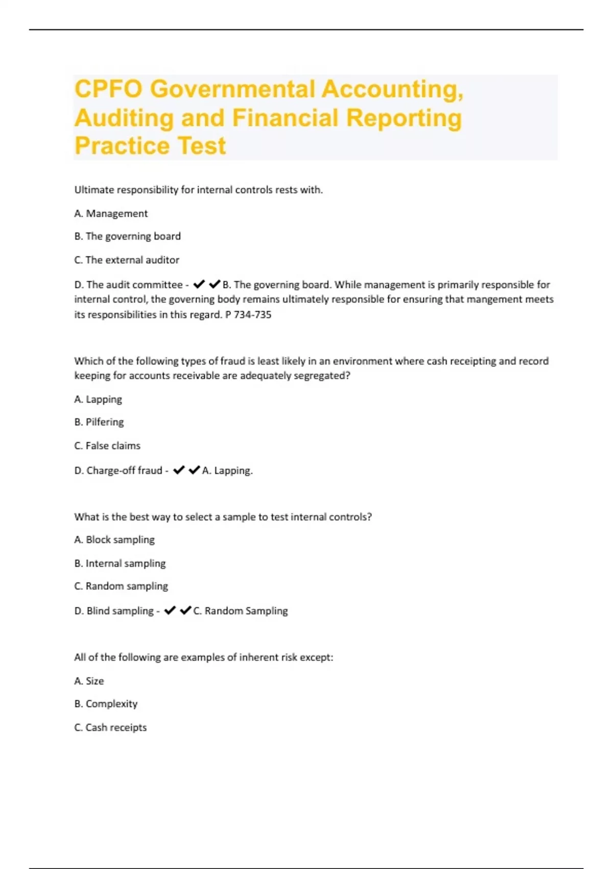 Ultimate responsibility for internal controls rests with. A. Management B. The governing board C. The external auditor D. The audit committee - B. The governing board. While management is primarily responsible for internal control, the governing body remains ultimately responsible for ensuring that mangement meets its responsibilities in this regard. P 734-735 Which of the following types of fraud is least likely in an environment where cash receipting and record keeping for accounts receivable are adequately segregated? A. Lapping B. Pilfering C. False claims D. Charge-off fraud - A. Lapping. What is the best way to select a sample to test internal controls? A. Block sampling B. Internal sampling C. Random sampling D. Blind sampling - C. Random Sampling All of the following are examples of inherent risk except: A. Size B. Complexity C. Cash receiptsD. Prior problems - A. Size. There are 5 situations commonly recognized as inherent risk. 1. Complexity 2. Cash receipts 3. Direct payments to third-party beneficiaries 4. Hsitory of prior problems 5. History of prior unresponsiveness to identical control deficiencies P 740 Which is not an example of a control procedure? A. Authorization B. Segregation of incompatible duties C. Analytical review D. Mandatory holidays - D. Mandatory holidays. There are 7 categories of control-related policies. 1. Procedures to ensure that transactions are properly authorized 2. Control to secure assets and accounting records 3. Segregation of incompatible duties 4. Periodic reconciliations 5. Periodic verificatins 6. Analytical review of accounting data for reasonableness 7. Properly designed records Which of the following is the most important element in a comprehensive framework of internal controls? A. Monitoring B. Risk assessment C. Communication D. Control environment -D. Control environment. It must provide a favorable control environment. P 736