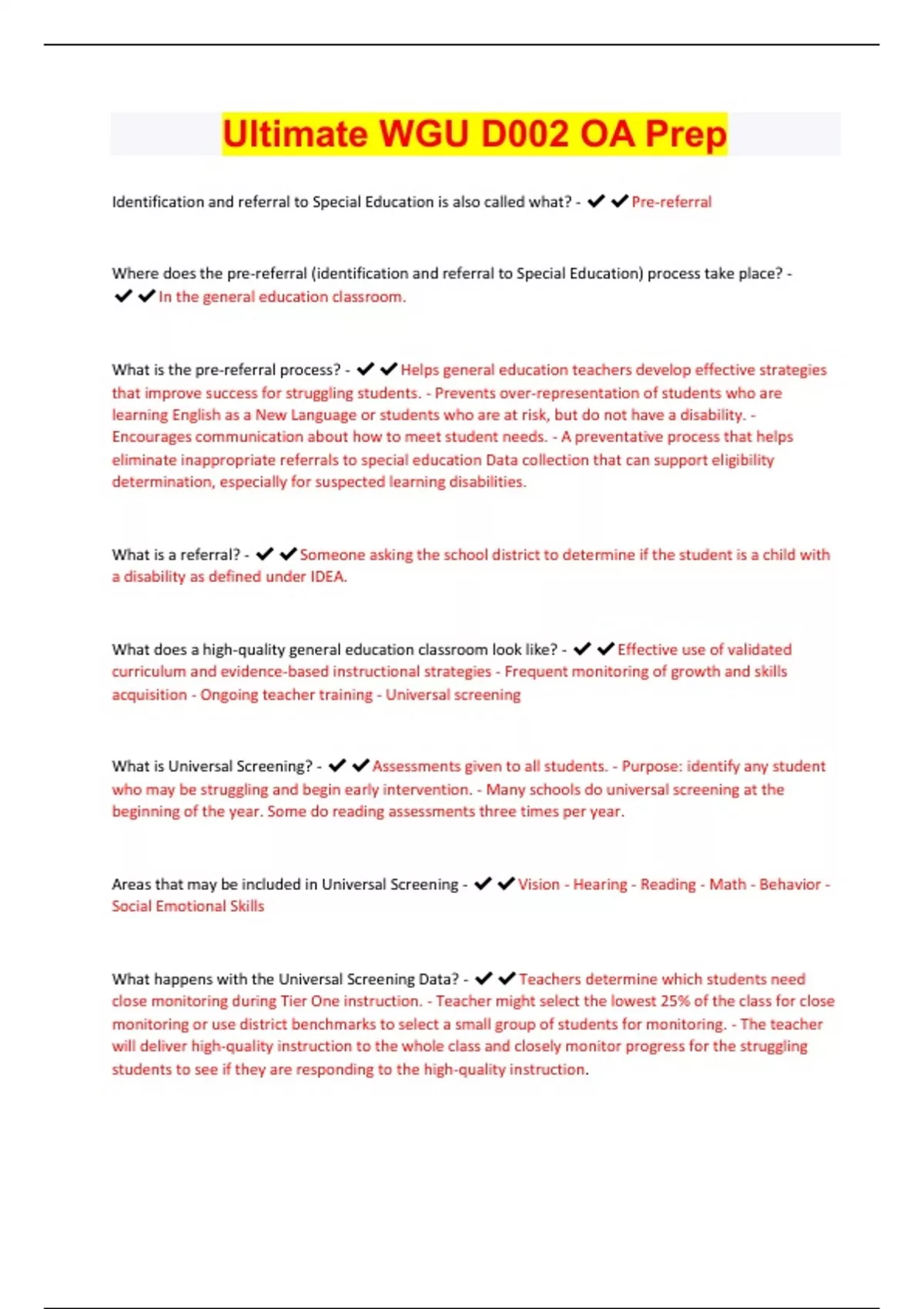 Ultimate WGU D002 OA Prep Identification and referral to Special Education is also called what? -Pre-referral Where does the pre-referral (identification and referral to Special Education) process take place? - In the general education classroom. What is the pre-referral process? -Helps general education teachers develop effective strategies that improve success for struggling students. - Prevents over-representation of students who are learning English as a New Language or students who are at risk, but do not have a disability. - Encourages communication about how to meet student needs. - A preventative process that helps eliminate inappropriate referrals to special education Data collection that can support eligibility determination, especially for suspected learning disabilities. What is a referral? -Someone asking the school district to determine if the student is a child with a disability as defined under IDEA. What does a high-quality general education classroom look like? -Effective use of validated curriculum and evidence-based instructional strategies - Frequent monitoring of growth and skills acquisition - Ongoing teacher training - Universal screening What is Universal Screening? -Assessments given to all students. - Purpose: identify any student who may be struggling and begin early intervention. - Many schools do universal screening at the beginning of the year. Some do reading assessments three times per year. Areas that may be included in Universal Screening -Vision - Hearing - Reading - Math - Behavior - Social Emotional Skills What happens with the Universal Screening Data? -Teachers determine which students need close monitoring during Tier One instruction. - Teacher might select the lowest 25% of the class for close monitoring or use district benchmarks to select a small group of students for monitoring. - The teacher will deliver high-quality instruction to the whole class and closely monitor progress for the struggling students to see if they are responding to the high-quality instruction. What happens in a Tier 1 classroom? -Uses evidence-based, scientifically researched core curriculum materials - Aligns to state standards. - Teachers trained in how to deliver the curriculum. - Student progress is monitored regularly. - About 75-80% of students reach competency in Tier 1. What are some things that might spark an initial concern about a student? -Falling grades - Difficulty comprehending what is read - Motivation decreases - Behaviors (e.g., acting out or withdrawn) - Non-compliance - Executive functioning concerns (e.g., lack of organization, task initiation, impulse control) - Social-emotional concerns (e.g. lack of confidence, difficulty with change) - Trauma (e.g., family death, divorce, starting a new school) - Significant absences How does the teacher know the student is not meeting competency in Tier 1? -Data analysis. - Is the rate of learning sufficient for the student to reach the average range with peers in a reasonable amount of time? - Can the intensity of interventions be maintained in the general education classroom or is more needed? - Is the student able to reach the average range with accommodations? : Remember, anyone can have an accommodation. We are simply providing access. What happens to a student who is not meeting competency in Tier 1? -Begins additional small group instruction and more intensive monitoring - Tier 2. What happens in Tier 2? -This is supplemental to what the student continues to receive in Tier 1. - A small group of students may be pulled aside while Tier 1 students are completing some independent work or working in stations. - Tier 2 focuses on specific skill-building and practice. - The teacher chunks down what was taught in Tier 1 and reteaches a smaller chunk, using different strategies and tools. For example, if the students are working on 1:1 correspondence for numerals 1-10; in the Tier 2 group, the students might work on numerals 1-5. - The small group might meet 2-3 times per week to practice the skill. - Skill progress is assessed more frequently than in Tier 1. - Goal is for student to reach the average range in the skill and return to success in Tier 1. How do we know if the student is making adequate progress in Tier 2? -Example of a student responding positively to the Intervention This fourth grade student had 9 weeks of small group instruction 1 hour/day, 5 days/week. Progress monitoring results indicated a 24-point increase, At the current Rate of Improvement (ROI), the student will "catch up" to the 4th grade EOY benchmark with an additional 3 weeks of instruction What is Tier 3 intervention in RTI? -This is supplemental to what the student continues to receive in Tier 1. - An individual student may be pulled aside while Tier 1 students are completing some independent work or working in stations. -bTier 3 focuses on more time, more attention and special resources - The small group might meet 4-5 times per week to practice the skill. - Skill progress is assessed more frequently than in Tier 2 - Goal is for student to reach the average range in the skill and return to success in Tier 1. Is Tier 3 Special Education? -No. Tier 3 is part of general education. What is the IDEA Special Rule for eligibility determination? -Under Section 300.306 of IDEA, the Special Rule states that a student cannot be found eligible for special education if, the main challenge for the student is: o Lack of appropriate instruction in reading o Lack of appropriate instruction in math o Limited English proficiency Why is the IDEA Special Rule for eligibility determination important in pre-referral? - • The general education staff must provide data to the eligibility determination team that demonstrates the student has had appropriate instruction in reading and math. The student has had the opportunity to learn those academic subjects. • The general education staff must provide data to the eligibility team that demonstrates that in 
