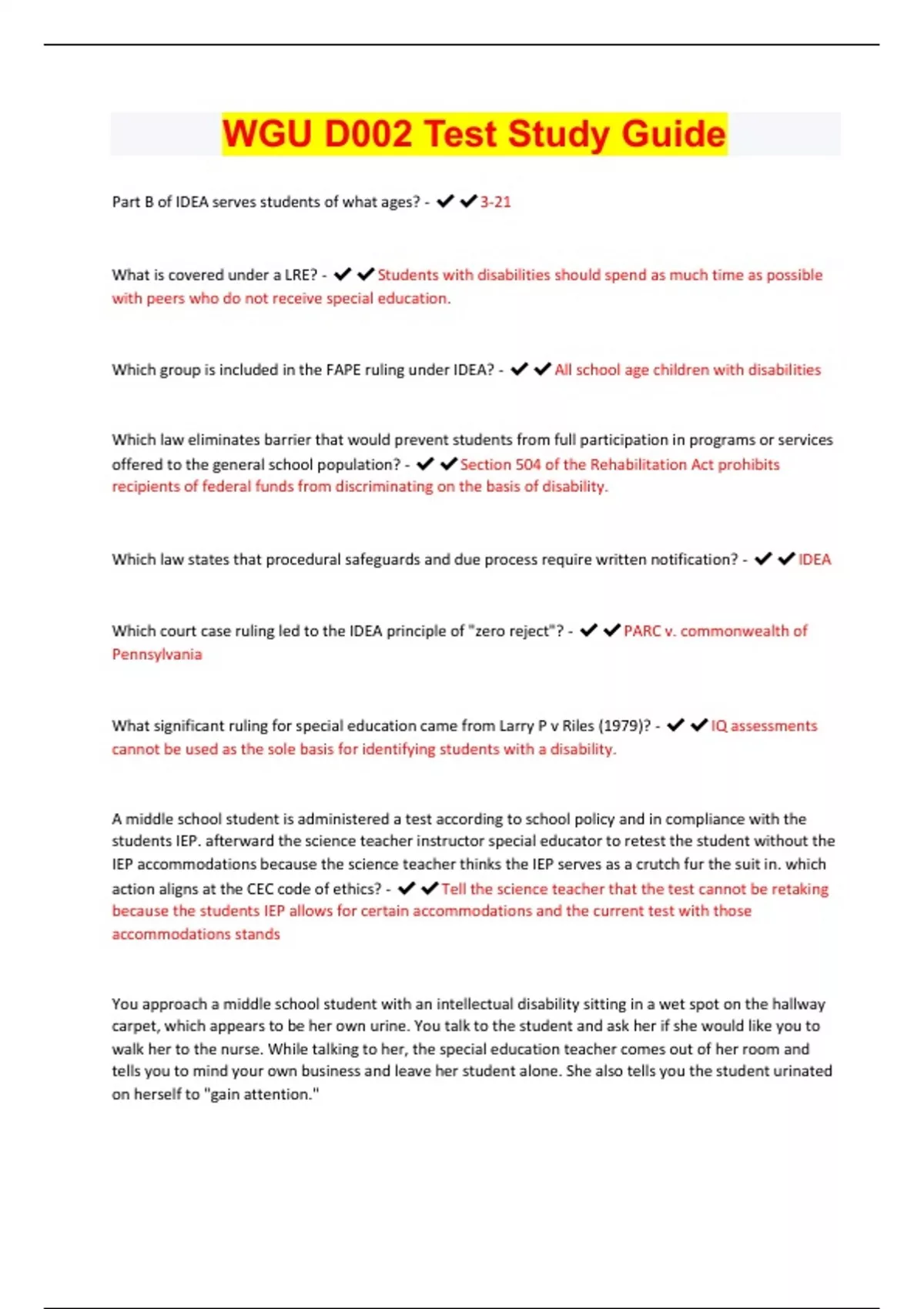WGU D002 Test Study Guide Part B of IDEA serves students of what ages? -3-21 What is covered under a LRE? -Students with disabilities should spend as much time as possible with peers who do not receive special education. Which group is included in the FAPE ruling under IDEA? -All school age children with disabilities Which law eliminates barrier that would prevent students from full participation in programs or services offered to the general school population? -Section 504 of the Rehabilitation Act prohibits recipients of federal funds from discriminating on the basis of disability. Which law states that procedural safeguards and due process require written notification? -IDEA Which court case ruling led to the IDEA principle of "zero reject"? -PARC v. commonwealth of Pennsylvania What significant ruling for special education came from Larry P v Riles (1979)? -IQ assessments cannot be used as the sole basis for identifying students with a disability. A middle school student is administered a test according to school policy and in compliance with the students IEP. afterward the science teacher instructor special educator to retest the student without the IEP accommodations because the science teacher thinks the IEP serves as a crutch fur the suit in. which action aligns at the CEC code of ethics? -Tell the science teacher that the test cannot be retaking because the students IEP allows for certain accommodations and the current test with those accommodations stands You approach a middle school student with an intellectual disability sitting in a wet spot on the hallway carpet, which appears to be her own urine. You talk to the student and ask her if she would like you to walk her to the nurse. While talking to her, the special education teacher comes out of her room and tells you to mind your own business and leave her student alone. She also tells you the student urinated on herself to "gain attention." What is the next thing you should do? -Step away