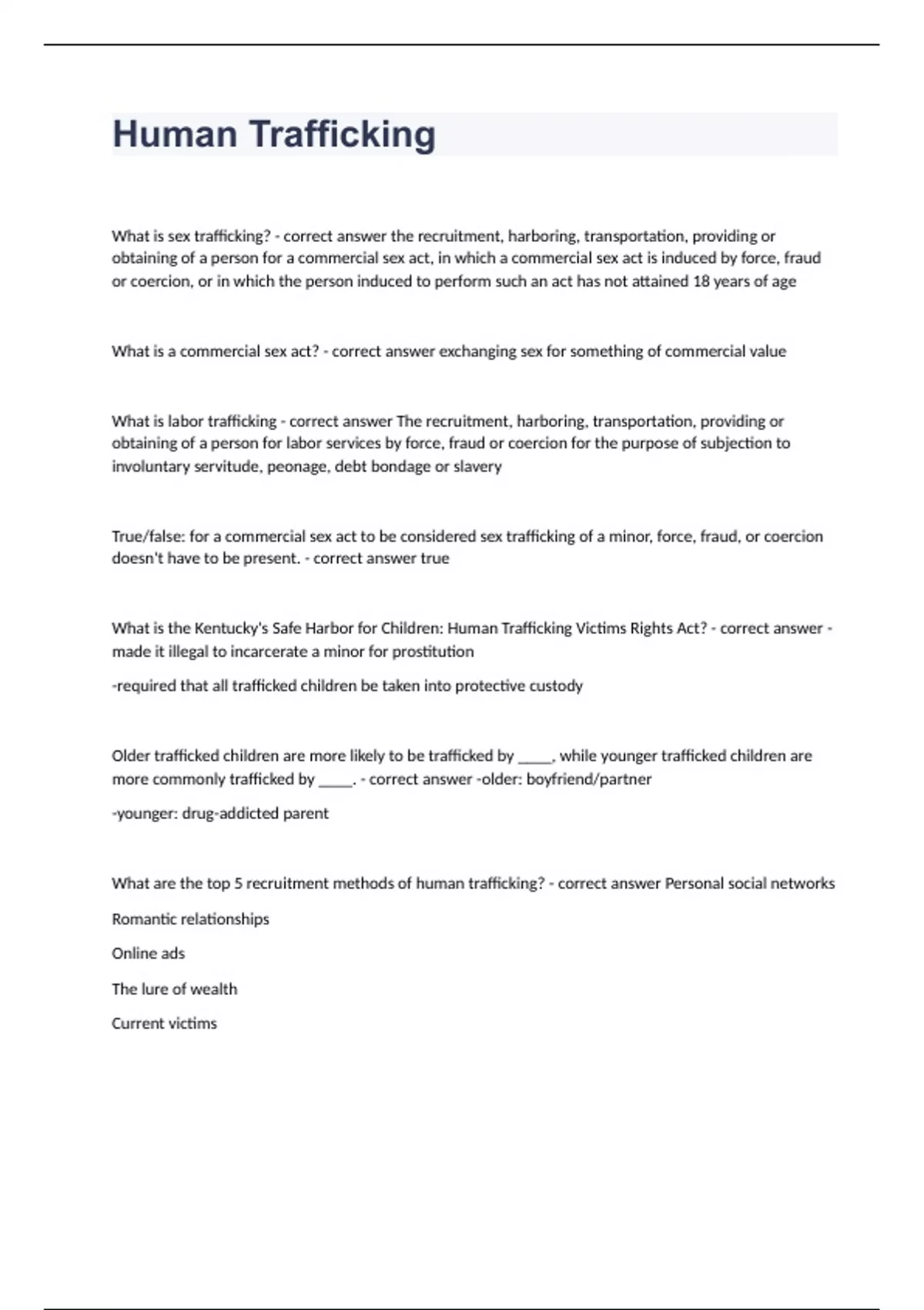 Human TraffickingWhat is sex trafficking? - correct answer the recruitment, harboring, transportation, providing or obtaining of a person for a commercial sex act, in which a commercial sex act is induced by force, fraud or coercion, or in which the person induced to perform such an act has not attained 18 years of age What is a commercial sex act? - correct answer exchanging sex for something of commercial value What is labor trafficking - correct answer The recruitment, harboring, transportation, providing or obtaining of a person for labor services by force, fraud or coercion for the purpose of subjection to involuntary servitude, peonage, debt bondage or slavery True/false: for a commercial sex act to be considered sex trafficking of a minor, force, fraud, or coercion doesn't have to be present. - correct answer true What is the Kentucky's Safe Harbor for Children: Human Trafficking Victims Rights Act? - correct answer -made it illegal to incarcerate a minor for prostitution -required that all trafficked children be taken into protective custody Older trafficked children are more likely to be trafficked by ____, while younger trafficked children are more commonly trafficked by ____. - correct answer -older: boyfriend/partner -younger: drug-addicted parent What are the top 5 recruitment methods of human trafficking? - correct answer Personal social networks Romantic relationships Online ads The lure of wealth Current victims Describe personal social network recruitment method. - correct answer Traffickers commonly recruit friends of family members, friends of other girls they have trafficked, and others in their neighborhood. They recruit in many places such as malls, transit stations, beaches, gas stations, campuses, clubs, and restaurants. Schools, malls, and transit locations in particular are associated with minors. Describe romantic relationships recruitment method. - correct answer Many traffickers engage in romantic or physical relationships with the recruits to appeal to their victims' emotional and economic needs. They use a sort of bait and switch tactic, building a relationship with the victim, then asking the victim to engage in commercial sex to help the two of them accomplish their dreams of being together. Describe online ads recruitment method - correct answer Ads for recruitment often pose as a legitimate employment opportunity, calling for "models" and presenting the opportunity for a photo shoot. Traffickers also search existing online advertisements on sites like Craigslist and Backpage for women and girls who might be working independently. Labor trafficking victims are often recruited through false job ads. Describe lure of wealth recruitment method - correct answer Former traffickers said that pointing out to victims that they were "already doing it for free" particularly influential with those who were economically disadvantaged. The traffickers offer the victim economic security. For traffickers, prominently displaying their wealth was key to recruiting with many citing their outward displays of wealth as a primary means of attraction for victims. Describe current victims recruitment methods - correct answer Girls already involved with the trafficker are often made to help with recruiting, especially from train stations, bus stops, bus stations, clubs, detention facilities, group homes, continuation schools, homeless shelters, and from social media. What are the steps of the grooming process? - correct answer 1. targeting a victim 2. gaining trust and information 3. filling a need 4. isolation 5. abuse begins 6. maintains control (fear, threats and violence)