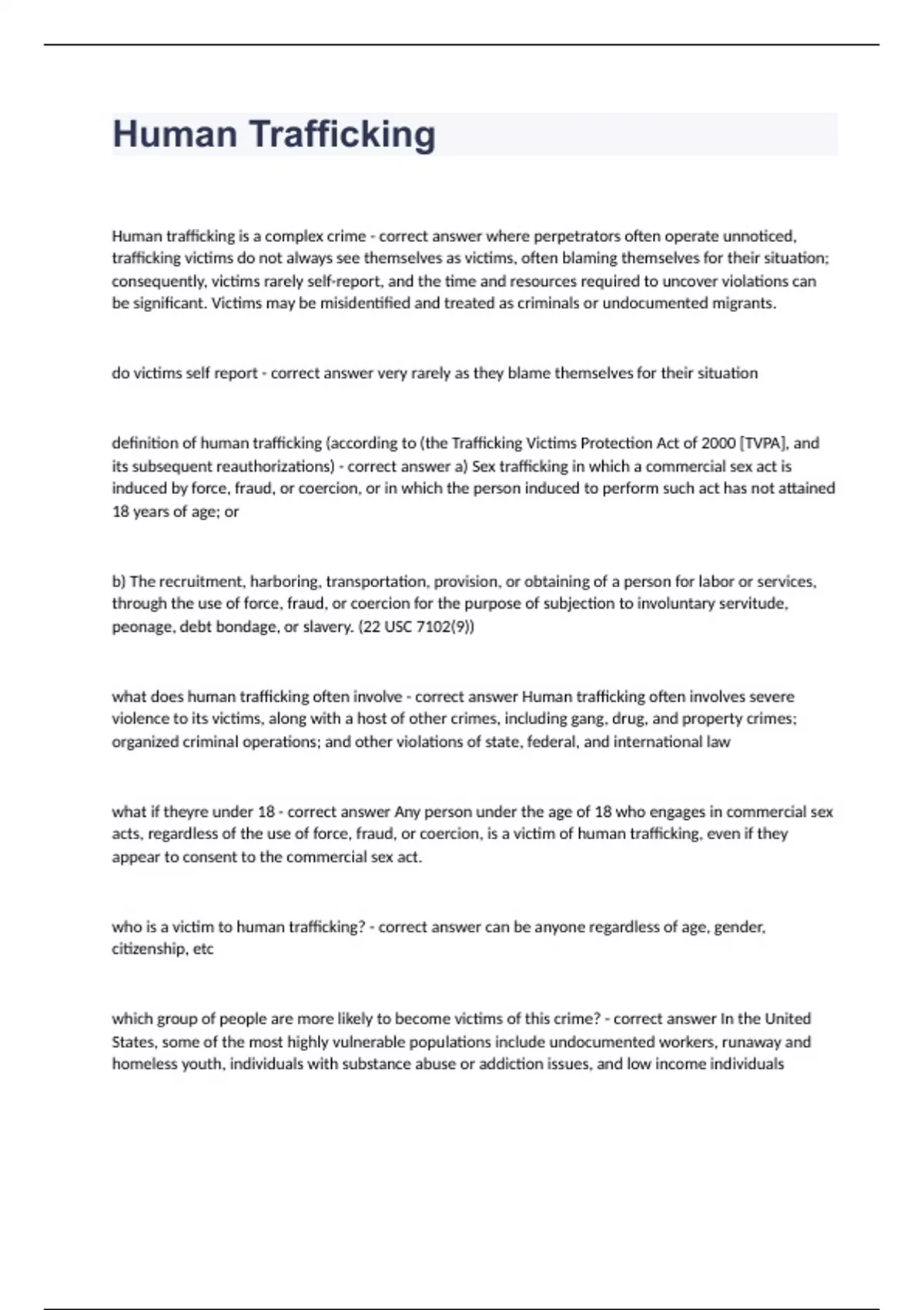 Human TraffickingHuman trafficking is a complex crime - correct answer where perpetrators often operate unnoticed, trafficking victims do not always see themselves as victims, often blaming themselves for their situation; consequently, victims rarely self-report, and the time and resources required to uncover violations can be significant. Victims may be misidentified and treated as criminals or undocumented migrants. do victims self report - correct answer very rarely as they blame themselves for their situation definition of human trafficking (according to (the Trafficking Victims Protection Act of 2000 [TVPA], and its subsequent reauthorizations) - correct answer a) Sex trafficking in which a commercial sex act is induced by force, fraud, or coercion, or in which the person induced to perform such act has not attained 18 years of age; or b) The recruitment, harboring, transportation, provision, or obtaining of a person for labor or services, through the use of force, fraud, or coercion for the purpose of subjection to involuntary servitude, peonage, debt bondage, or slavery. (22 USC 7102(9)) what does human trafficking often involve - correct answer Human trafficking often involves severe violence to its victims, along with a host of other crimes, including gang, drug, and property crimes; organized criminal operations; and other violations of state, federal, and international law what if theyre under 18 - correct answer Any person under the age of 18 who engages in commercial sex acts, regardless of the use of force, fraud, or coercion, is a victim of human trafficking, even if they appear to consent to the commercial sex act. who is a victim to human trafficking? - correct answer can be anyone regardless of age, gender, citizenship, etc which group of people are more likely to become victims of this crime? - correct answer In the United States, some of the most highly vulnerable populations include undocumented workers, runaway and homeless youth, individuals with substance abuse or addiction issues, and low income individuals victim vs survivor - correct answer For example, the term "victim" has legal implications within the criminal justice process and refers to an individual who suffered harm as a result of criminal conduct. Victims are elgible for particular rights and legal standing within the criminal justice system. Survivor is a term used widely in service providing organizations to recognize the strength and courage it takes to overcome victimization Who is a Trafficker? - correct answer Trafficking perpetrators can be foreign nationals or U.S. citizens and include pimps, family members, peers and intimate partners, gangs and criminal networks, diplomats, business owners (legitimate and those operating as a commercial front for the illicit activity), labor brokers, farm owners, factories, and companies large and small. what do victims and traffickers have in common usually - correct answer Many victims and traffickers share ethnic or cultural backgrounds. In these cases, traffickers are better able to understand, gain trust, and ultimately exploit victims. Laura J. Lederer and Christopher A Wetzel - correct answer a) provides evidence that women and children who are trafficked into prostitution are physically, mentally, and emotionally devastated by this crime and this devastation is lasting: with injuries, illnesses, and impairments continuing for decades. b) They also describe the healthcare system is failing trafficked women and children: It makes the case that health care providers of all kinds - in emergency wards, healthcare clinics, and private practices - are seeing trafficking victims but failing to identify them, thereby unwittingly contributing to continuing criminal activity and exacerbating both public and private physical and mental health problems for this segment of the population examples of sex trafficking - correct answer Massage Parlors Escort Services Residential Brothels Street Prostitution Child Sex Tourism