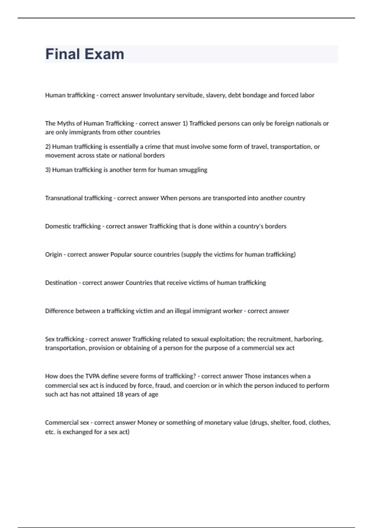 Final ExamHuman trafficking - correct answer Involuntary servitude, slavery, debt bondage and forced labor The Myths of Human Trafficking - correct answer 1) Trafficked persons can only be foreign nationals or are only immigrants from other countries 2) Human trafficking is essentially a crime that must involve some form of travel, transportation, or movement across state or national borders 3) Human trafficking is another term for human smuggling Transnational trafficking - correct answer When persons are transported into another country Domestic trafficking - correct answer Trafficking that is done within a country's borders Origin - correct answer Popular source countries (supply the victims for human trafficking) Destination - correct answer Countries that receive victims of human trafficking Difference between a trafficking victim and an illegal immigrant worker - correct answer Sex trafficking - correct answer Trafficking related to sexual exploitation; the recruitment, harboring, transportation, provision or obtaining of a person for the purpose of a commercial sex act How does the TVPA define severe forms of trafficking? - correct answer Those instances when a commercial sex act is induced by force, fraud, and coercion or in which the person induced to perform such act has not attained 18 years of age Commercial sex - correct answer Money or something of monetary value (drugs, shelter, food, clothes, etc. is exchanged for a sex act) Sex trafficking - correct answer When a person is bought or sold for sexual use and the exchange somehow benefits another person In the U.S., if the victim is under the age of _______, there does not have to be force, fraud or coercion in order for sex trafficking to occur - correct answer 18 Reasons why human trafficking remains undetected - correct answer 1) Human trafficking is underground and hidden by its nature; it occurs out of sight of people 2) Many countries do not take trafficking seriously and law enforcement often participates in it 3) Most victims do not report their victimizations to authorities What do we know about the extent of human trafficking? (Globally) - correct answer In early estimates, about 50,000 women/children and more recent estimates show 14,000-17,000 individuals trafficked annually ________ million adults and children are trafficked across the globe - correct answer 2.5 million In the private economy, ________% of men are exploited in labour - correct answer 60% In the private economy, _________% of women are sexually exploited - correct answer 98% Less than ______% of current trafficking victims have been identified - correct answer 1% What do we know about the extent of human trafficking? (In Texas) - correct answer El Paso and Houston are major HT centers, 38% of all calls to the National Trafficking Resource Center originated in TX, I-10 is identified as one of the main routes for human trafficking Who are the players in human trafficking? - correct answer Trafficker/Pimp (aka "Daddy", Facilitator, Buyer/Johns Trafficker/Pimp ("Daddy" - correct answer Anyone that receives money or something of value for the exploitation of another person