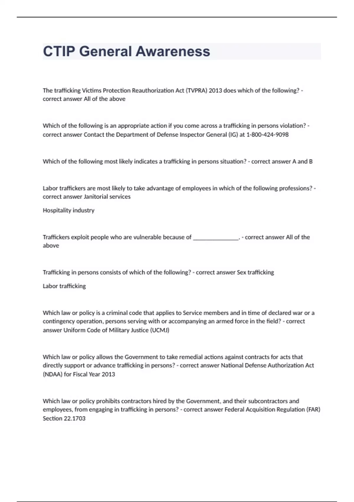 CTIP General Awareness The trafficking Victims Protection Reauthorization Act (TVPRA) 2013 does which of the following? - correct answer All of the above Which of the following is an appropriate action if you come across a trafficking in persons violation? - correct answer Contact the Department of Defense Inspector General (IG) at Which of the following most likely indicates a trafficking in persons situation? - correct answer A and B Labor traffickers are most likely to take advantage of employees in which of the following professions? - correct answer Janitorial services Hospitality industry Traffickers exploit people who are vulnerable because of ______________. - correct answer All of the above Trafficking in persons consists of which of the following? - correct answer Sex trafficking Labor trafficking Which law or policy is a criminal code that applies to Service members and in time of declared war or a contingency operation, persons serving with or accompanying an armed force in the field? - correct answer Uniform Code of Military Justice (UCMJ) Which law or policy allows the Government to take remedial actions against contracts for acts that directly support or advance trafficking in persons? - correct answer National Defense Authorization Act (NDAA) for Fiscal Year 2013 Which law or policy prohibits contractors hired by the Government, and their subcontractors and employees, from engaging in trafficking in persons? - correct answer Federal Acquisition Regulation (FAR) Section 22.1703 Which law or policy is the President's direction to all federal agencies to strengthen protections against trafficking in federal contracts by calling for stronger prohibitions on contractor engagement in human trafficking-related activities? - correct answer Executive Order 13237 Which law or policy provides specific guidance for Department of Defense acquisition workforce in reference to CTIP? - correct answer Defense Federal Acquisition Regulation Supplement (DFARS) 222.17 Which law or policy provides resources for holistic services for survivors, prohibits United States funds going to any country using child soldiers, and imposes reporting and compliance requirements on federal agencies, including the Deparment of Defense to ensure United States Government taxpayer money does not support human trafficking? - correct answer Trafficking Victims Protection Reauthorization Act (TVPRA) 2013 CPL Williams believes there are several possible indicators of sex traffickin in this bar. This is particularly disturbing because Service members appear to come to the establishment frequently. What should he do? Select all that apply. - correct answer Call the Department of Defense Inspector General (IG) Hotline (The Department of Defense Inspector General (IG) Hotline (,
