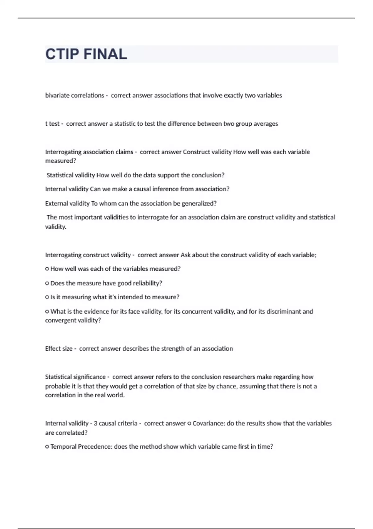 CTIP FINALbivariate correlations - correct answer associations that involve exactly two variables t test - correct answer a statistic to test the difference between two group averages Interrogating association claims - correct answer Construct validity How well was each variable measured? Statistical validity How well do the data support the conclusion? Internal validity Can we make a causal inference from association? External validity To whom can the association be generalized? The most important validities to interrogate for an association claim are construct validity and statistical validity. Interrogating construct validity - correct answer Ask about the construct validity of each variable; ○ How well was each of the variables measured? ○ Does the measure have good reliability? ○ Is it measuring what it's intended to measure? ○ What is the evidence for its face validity, for its concurrent validity, and for its discriminant and convergent validity? Effect size - correct answer describes the strength of an association Statistical significance - correct answer refers to the conclusion researchers make regarding how probable it is that they would get a correlation of that size by chance, assuming that there is not a correlation in the real world. Internal validity - 3 causal criteria - correct answer ○ Covariance: do the results show that the variables are correlated? ○ Temporal Precedence: does the method show which variable came first in time? ○ Internal Validity: is there a C variable that is associated with both A and B, independently? independent variables - correct answer manipulated variable dependent variables - correct answer measured variable (outcome) control variables - correct answer any variable that an experimenter holds constant; experiments establish covariance Covariance - correct answer Is the cause variable related to the effect variable?; Experiments support causal claims - correct answer control group - has no treatment condition; the neutral or no treatment level of the IV; not all experiments have, or need, a control group treatment group - correct answer has one or more treatment conditions placebo group - correct answer placed under placebo confounds-design confounds - correct answer when a second variable varies systematically along with the IV and provides an alternative explanation for the results; Another variable accidentally varies systematically along with the IV; Correct by control variables selection effects - correct answer Systematically different types of participants are in the two groups. correction - random assignment or matching random assignment - correct answer a way of assigning participants to levels of the IV such that each participant has an equal chance of being in each group. matched groups - correct answer Matching involves matching groups on some variable (e.g., IQ). ; We randomly assign the three participants with the highest IQs to the three groups, then assign the next three highest participants, and so on.