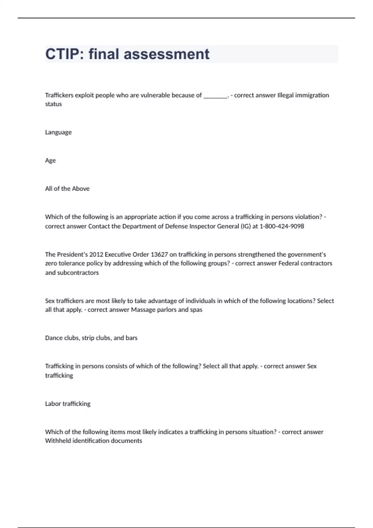 CTIP final assessmentTraffickers exploit people who are vulnerable because of _______. - correct answer Illegal immigration status Language Age All of the Above Which of the following is an appropriate action if you come across a trafficking in persons violation? - correct answer Contact the Department of Defense Inspector General (IG) at The President's 2012 Executive Order 13627 on trafficking in persons strengthened the government's zero tolerance policy by addressing which of the following groups? - correct answer Federal contractors and subcontractors Sex traffickers are most likely to take advantage of individuals in which of the following locations? Select all that apply. - correct answer Massage parlors and spas Dance clubs, strip clubs, and bars Trafficking in persons consists of which of the following? Select all that apply. - correct answer Sex trafficking Labor trafficking Which of the following items most likely indicates a trafficking in persons situation? - correct answer Withheld identification documents The National Defense Authorization Act (NDAA) for Fiscal Year 2013 prohibits contractors from performing which of the following actions? - correct answer Confiscating identity documents Failing to meet housing and safety standards of the host country Offering employment using fraudulent or misleading recruiting practices Labor traffickers are most likely to take advantage of employees in which of the following professions? - correct answer Janitorial services, hospitality industry Which of the following most likely indicates a trafficking in persons situation? - correct answer A and B The Trafficking Victims Protection Reauthorization Act (TVPRA) 2013 does which of the following? - correct answer All of the above